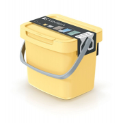 Pevný plastový otevírací malý koš 3l s madlem a víkem, šířka 20 cm, výška 17 cm, hloubka 15,5 cm, barva žlutá, vhodný na odpadky, prací prášek, tablety do myčky.