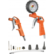 Sada příslušenství pro kompresory, hustilka pneumatik s manometrem, ofukovací pistole, stříkací pistole, spirálová hadice 4 m s rychlospojkami.