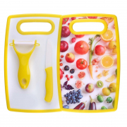 Plastové prkénko o rozměru 25 x 15,5 cm, škrabka s příčnou čepelí a nůž s keramickou čepelí 7cm. Mix dekorů, zasíláme dle skladové dostuponosti.