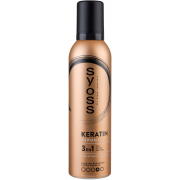 Pěnové tužidlo SYOSS Keratin 3v1 - styl, péče, ochrana. S vitamínovým komplexem, kombinací panthenolu a niacinamidu, pro zpevněnou strukturu vlasů. Hladké, poddajné a lesklé vlasy. Nelepivá fixace, bez viditelných zbytků, snadno se vyčesává.