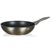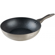 Hliníková lisovaná pánev WOK GRANITE o průměru 28 cm, výška 8 cm, nepřilnavý 2vrstvý kameninový povrch v granitovém dekoru, síla stěny 2,5 mm, šedá bakelitová rukojetí se soft-touch povrchovou úpravou, pánev je vhodná na všechny typy varných desek včetně indukce, nelze mýt v myčce na nádobí.