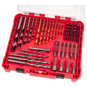 Sada 50 ks obsahuje vrtáky do kovu z HSS oceli o průměrech 1,5–2–2,5–3–3,5–4–4,5–5–6 mm, vrtáky do dřeva z HCS oceli o průměrech 4–5–6–8–10 mm, vrtáky do zdiva s SK plátky o průměrech 4–5–6–8–10 mm, hroty, bity a nástrčné hlavice z CrV oceli, bity 1/4" × 25 mm: ploché 4–5–6–7 mm, PH1–2–2–3, PZ1–2–2–3, TORX T10–15–20–25–30, SQ 1–2–3, hroty 1/4" × 50 mm: ploché 5–6 mm, PH2–3, PZ2–3, nástrčné hlavice (38 mm) 5–6–8–10 mm a magnetický nástavec na hroty 1/4" × 59 mm.