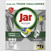 JAR Platinum tablety 75 ks Yellow (vše v jednom), to jsou tablety do myčky, které se nerozbalují. Účinkují již při 40°C. Tekutá část kapsle se silným odmašťujícím účinkem obsahuje již oplachovač, který nádobí zanechá lesklé. Změkčující sůl zanechá sklo beze skvrn, prášková část kapsle má funkci namáčení a její rychlá rozpustnost zajistí dokonalé odstranění odolných skvrn i od čaje. Spotřebujte do 18ti měsíců od data výroby uvedeném na obale.