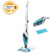 Tyčový a ruční vysavač s mopem 3 v 1, technologie CLICK & CLEAN pro snadné nasazení a odejmutí mopovacího nástavce, vysává a vytírá jedním tahem, kapacita mopovacího nástavce 150 ml = až 40 m2 čistých podlah, bezdrátový provoz - akumulátor 14,4 V Li-ion, doba provozu na jedno nabití až 45 minut, možnost přidání čisticího prostředku, nastavení dvou úrovní sacího výkonu, cyklónový filtrační systém pro lepší efektivitu vysávání, kontrolní LED diody na hubici osvětlující prostor před vysavačem, nabíjení akumulátoru cca 4-6 hod, světelná signalizace nabíjení, nabití a provozu, sklopná rukojeť, napájení 100-240 V (AC) / 18 V DC, příkon 95 W, objem nádoby na prach 0,5 l, hlučnost 80 dB(A) re 1pW FILTRACE, HEPA filtr, rotační turbokartáč, mopovací nástavec, 1x mopovací textilie z mikrovlákna pro univerzální použití na tvrdých podlahách, štěrbinová hubice, kartáček s jemnými štětinkami, adaptér 100-240 V (AC) / 18 V (DC), nálevka pro snadné doplňování vody, základna pro nabíjení.