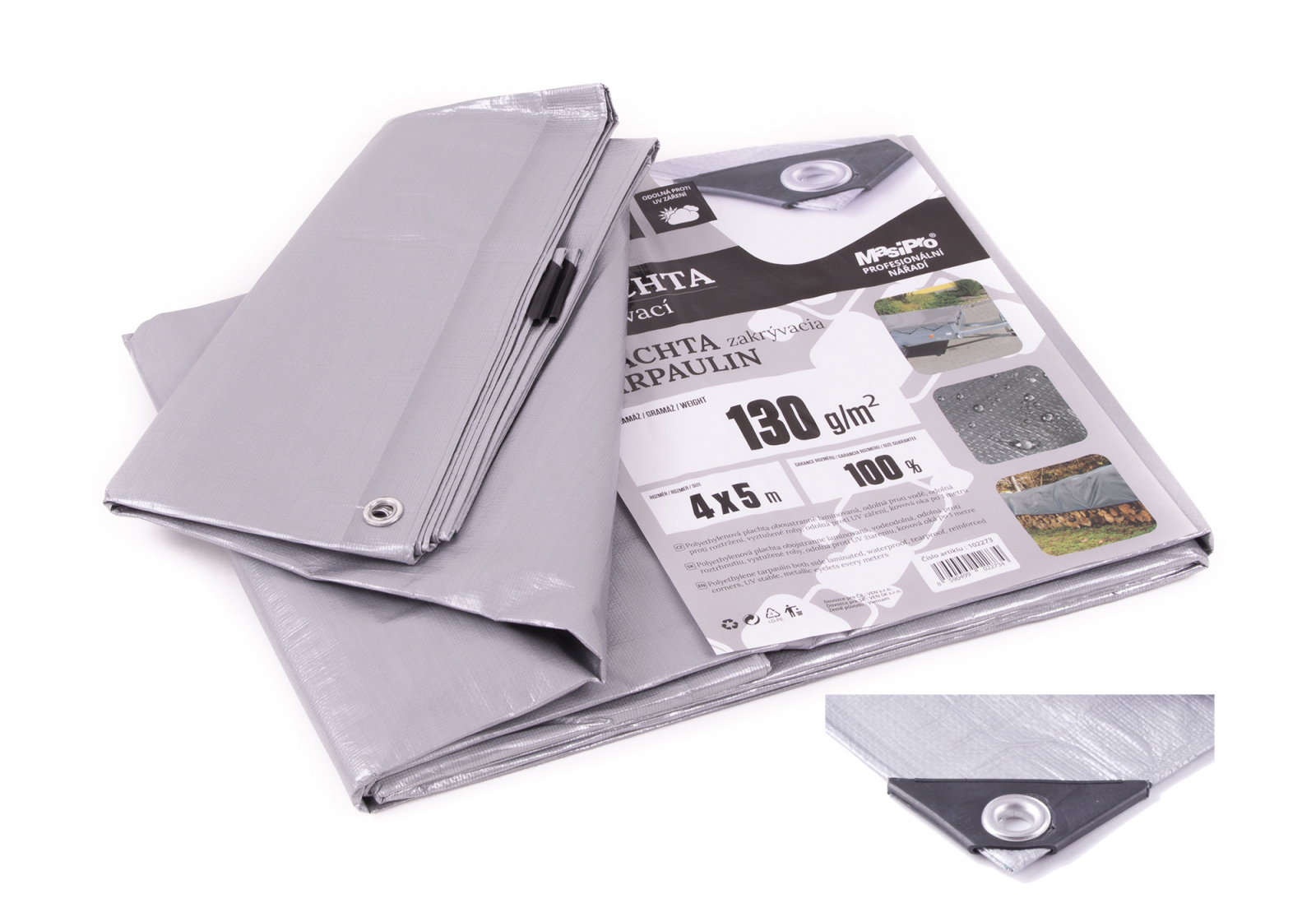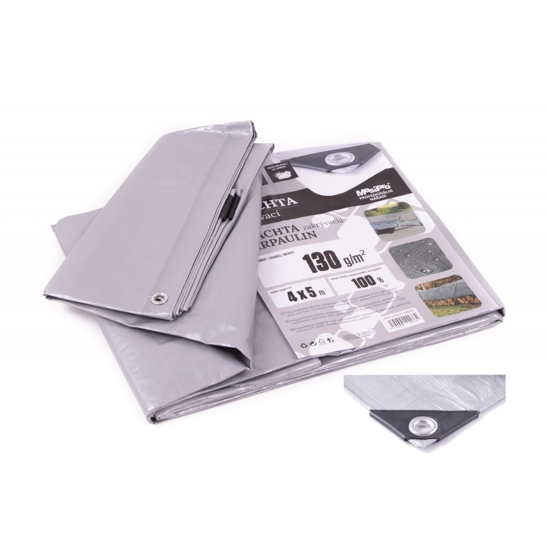 Plachta nepromokavá, 4 x 5 m, 130 g/m2, s vyztuženými rohy, rozměr plachty udáván před zapošitím, možná odchylka od uvedeného rozměru cca +-5 %, kovová oka pro uchycení každých 100 cm po celém obvodu plachty.