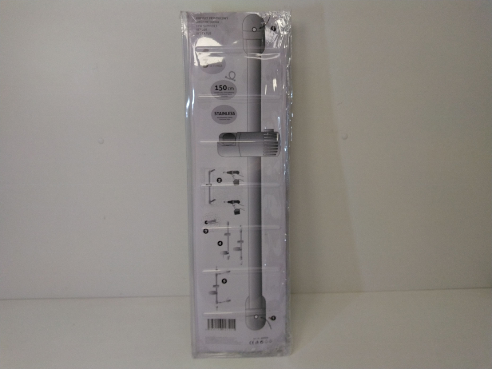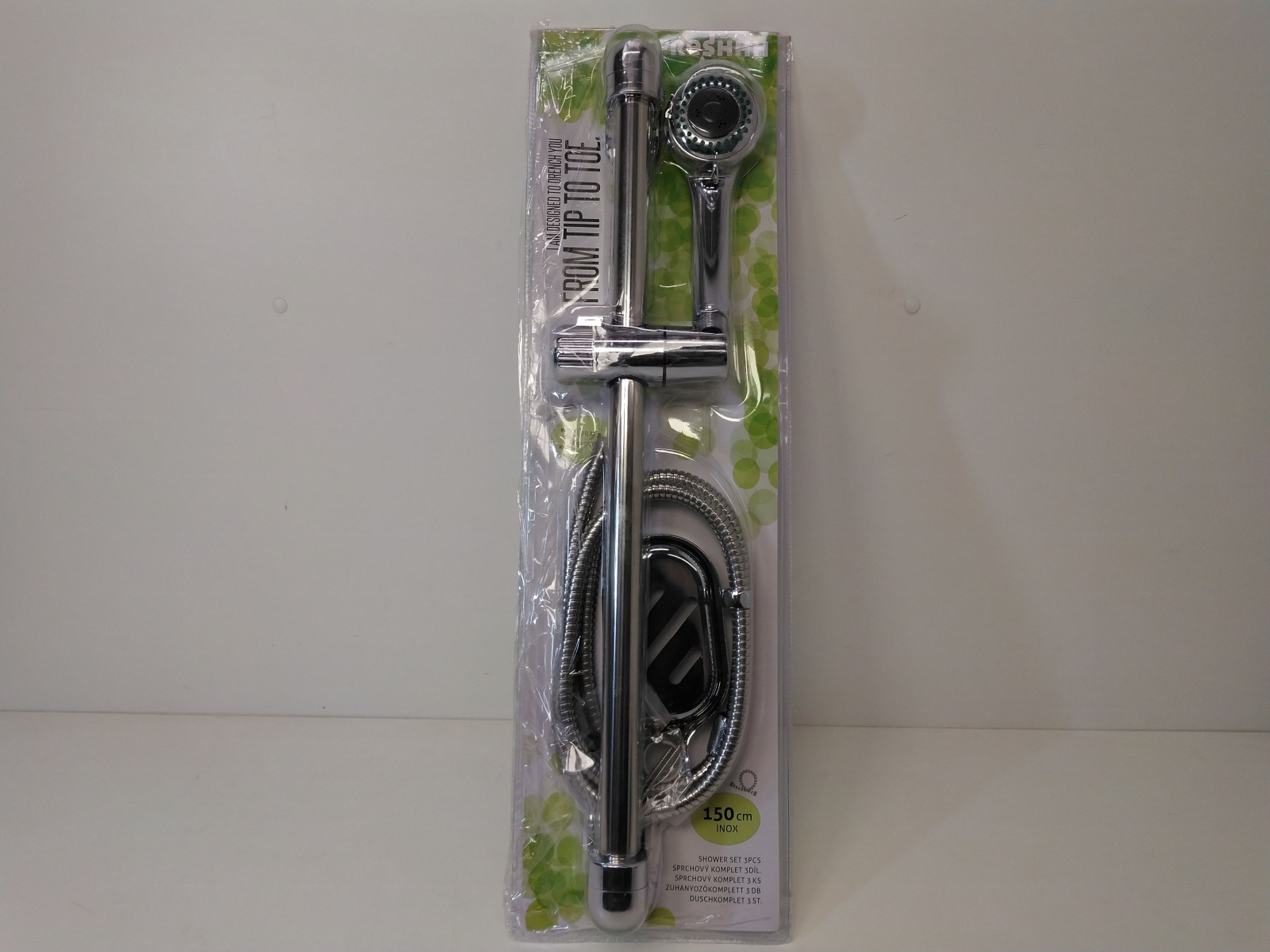 Sprchová sada: 3funkční sprchová hlavice, nastavitelná výška naklápěcího držáku na hlavici, kovová hadice 150 cm, tyč 54 cm.
