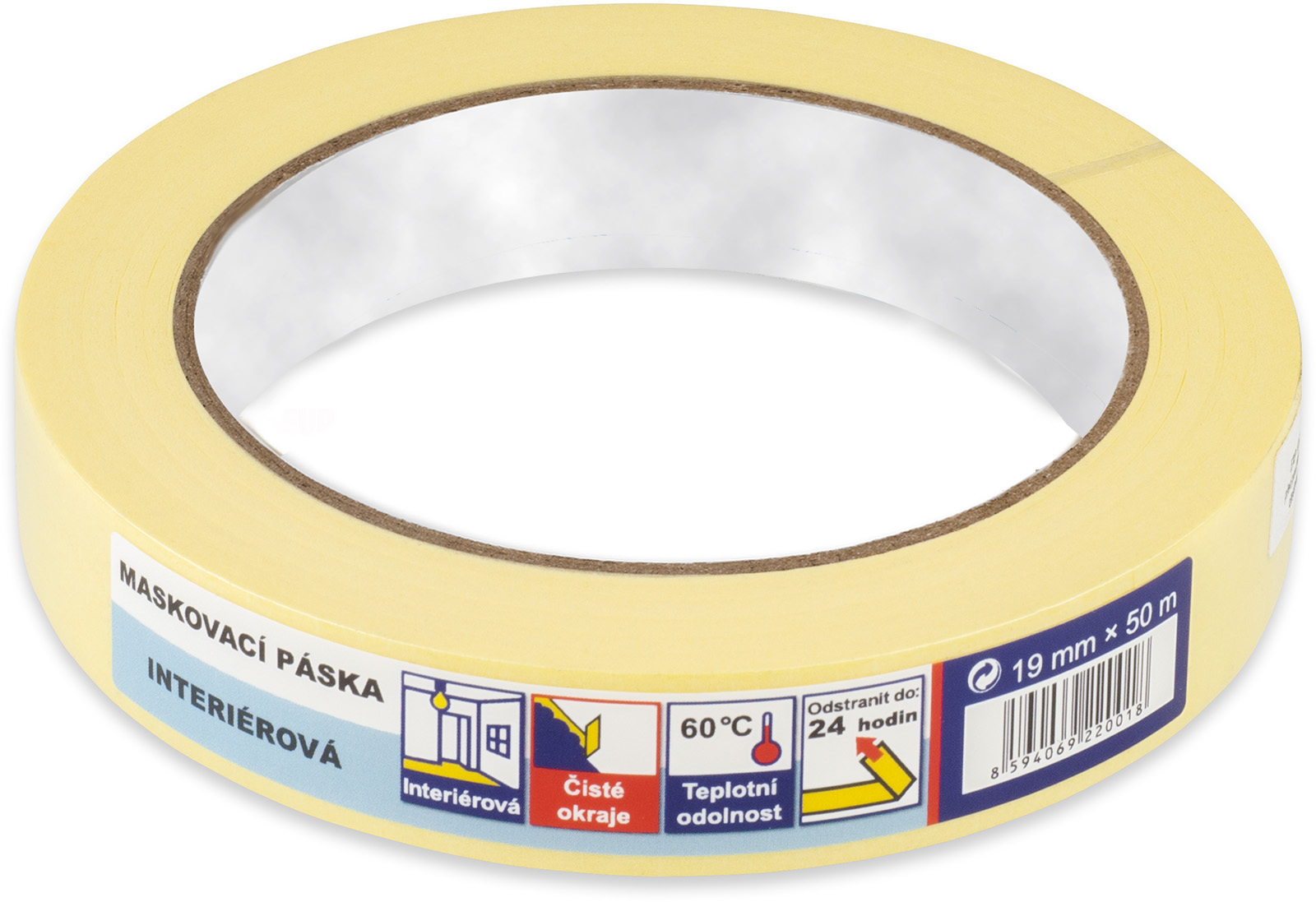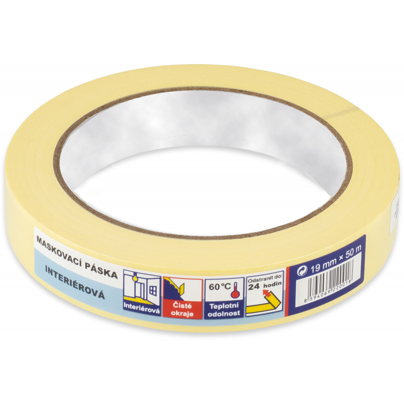 Maskovací páska z polokrepového papíru s nánosem lepidla na bázi přírodního kaučuku, umožňuje jednoduché odstranění bez zanechání zbytků lepidla, určena pro použití v interiéru pro malíře, lakýrníky a pro využití ve stavebnictví jako ochrana před potřísněním ploch nebo mechanický celý popism poškozením, pásku je nutné odstranit do 24 hodin od aplikace, jinak hrozí poškození podkladu (odloupnutí barvy atd.), šíře 75 mm, délka 50 metrů, tepelná odolnost do 60°C, tloušťka 110 my.