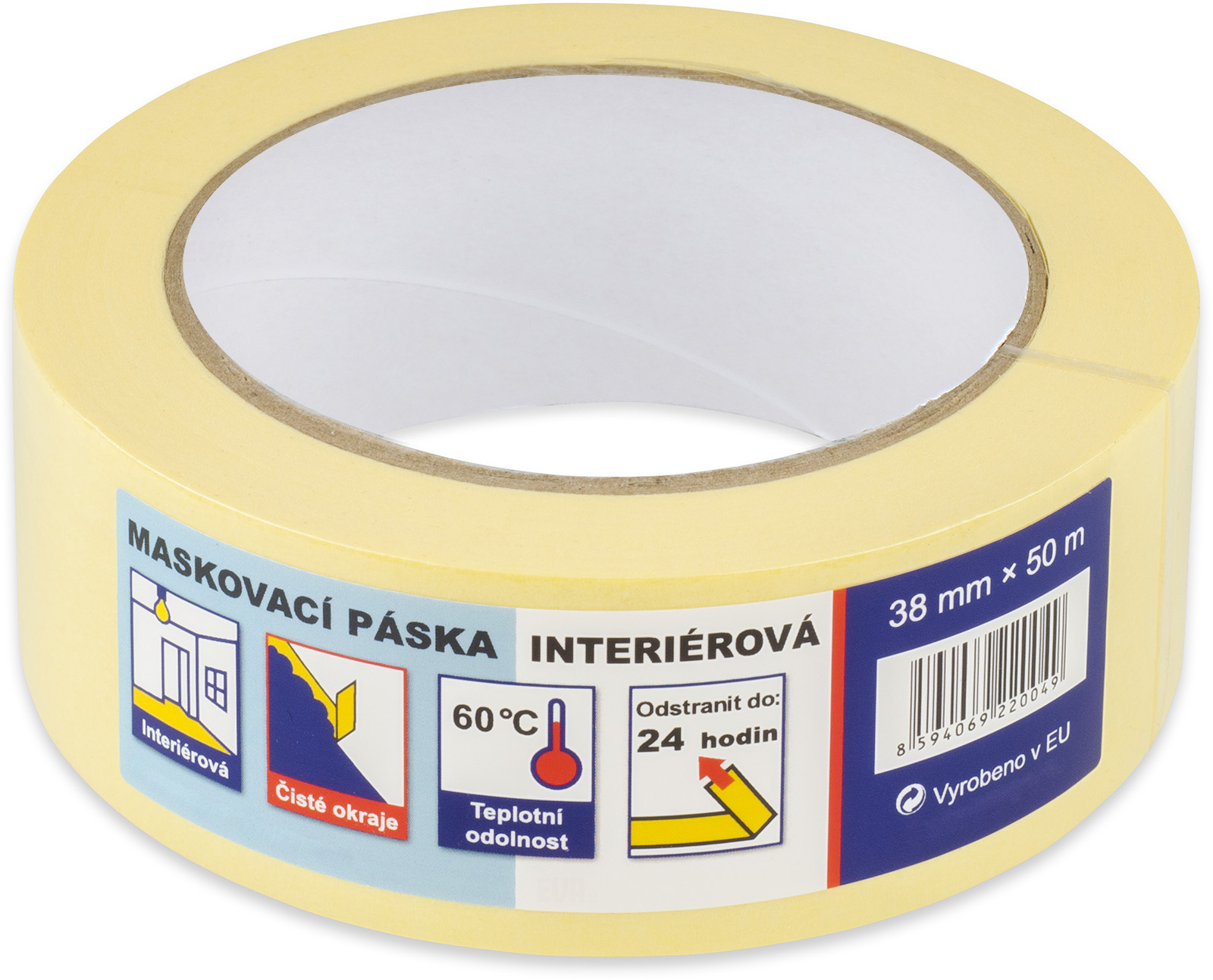 Maskovací páska z polokrepového papíru s nánosem lepidla na bázi přírodního kaučuku, umožňuje jednoduché odstranění bez zanechání zbytků lepidla, určena pro použití v interiéru pro malíře, lakýrníky a pro využití ve stavebnictví jako ochrana před potřísněním ploch nebo mechanický celý popism poškozením, pásku je nutné odstranit do 24 hodin od aplikace, jinak hrozí poškození podkladu (odloupnutí barvy atd.), šíře 38 mm, délka 50 metrů, tepelná odolnost do 60 °C, tloušťka 110 my.