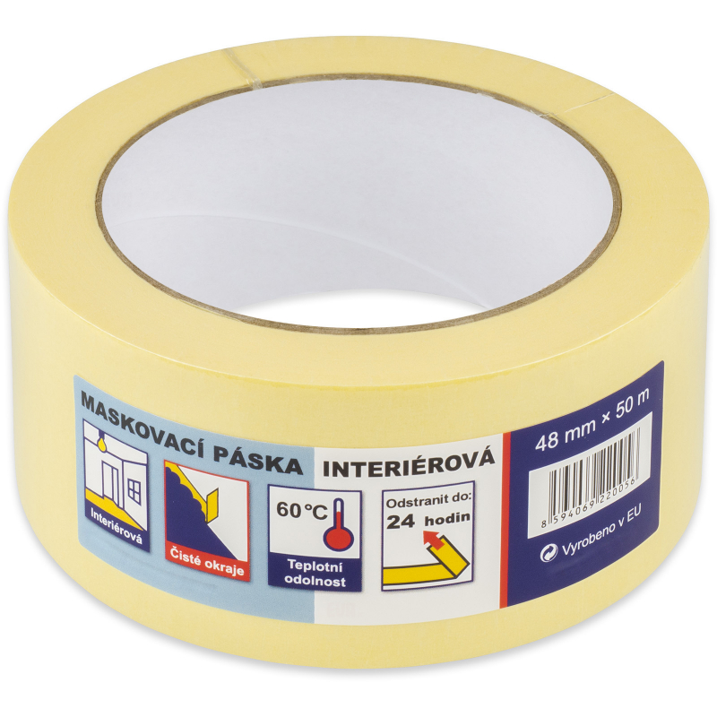 Maskovací páska z polokrepového papíru s nánosem lepidla na bázi přírodního kaučuku, umožňuje jednoduché odstranění bez zanechání zbytků lepidla, určena pro použití v interiéru pro malíře, lakýrníky a pro využití ve stavebnictví jako ochrana před potřísněním ploch nebo mechanický celý popism poškozením, pásku je nutné odstranit do 24 hodin od aplikace, jinak hrozí poškození podkladu (odloupnutí barvy atd.), šíře 48 mm, délka 50 metrů, tepelná odolnost do 60 °C, tloušťka 110 my.