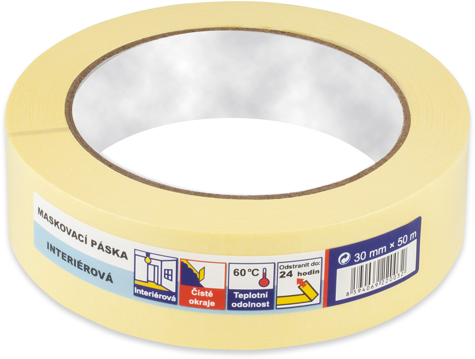 Maskovací páska z polokrepového papíru s nánosem lepidla na bázi přírodního kaučuku, umožňuje jednoduché odstranění bez zanechání zbytků lepidla, určena pro použití v interiéru pro malíře, lakýrníky a pro využití ve stavebnictví jako ochrana před potřísněním ploch nebo mechanický celý popism poškozením, pásku je nutné odstranit do 24 hodin od aplikace, jinak hrozí poškození podkladu (odloupnutí barvy atd.), šíře 30 mm, délka 50 metrů, tepelná odolnost do 60°C, tloušťka 110 my, baleno v průhledné folii.