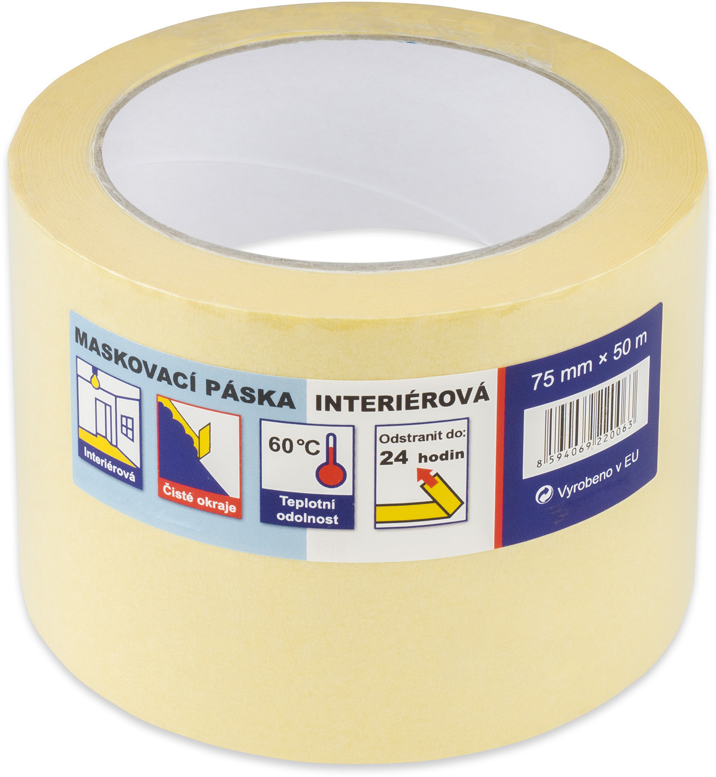 Maskovací páska z polokrepového papíru s nánosem lepidla na bázi přírodního kaučuku, umožňuje jednoduché odstranění bez zanechání zbytků lepidla, určena pro použití v interiéru pro malíře, lakýrníky a pro využití ve stavebnictví jako ochrana před potřísněním ploch nebo mechanický celý popism poškozením, pásku je nutné odstranit do 24 hodin od aplikace, jinak hrozí poškození podkladu (odloupnutí barvy atd.), šíře 75 mm, délka 50 metrů, tepelná odolnost do 60 °C, tloušťka 110 my.