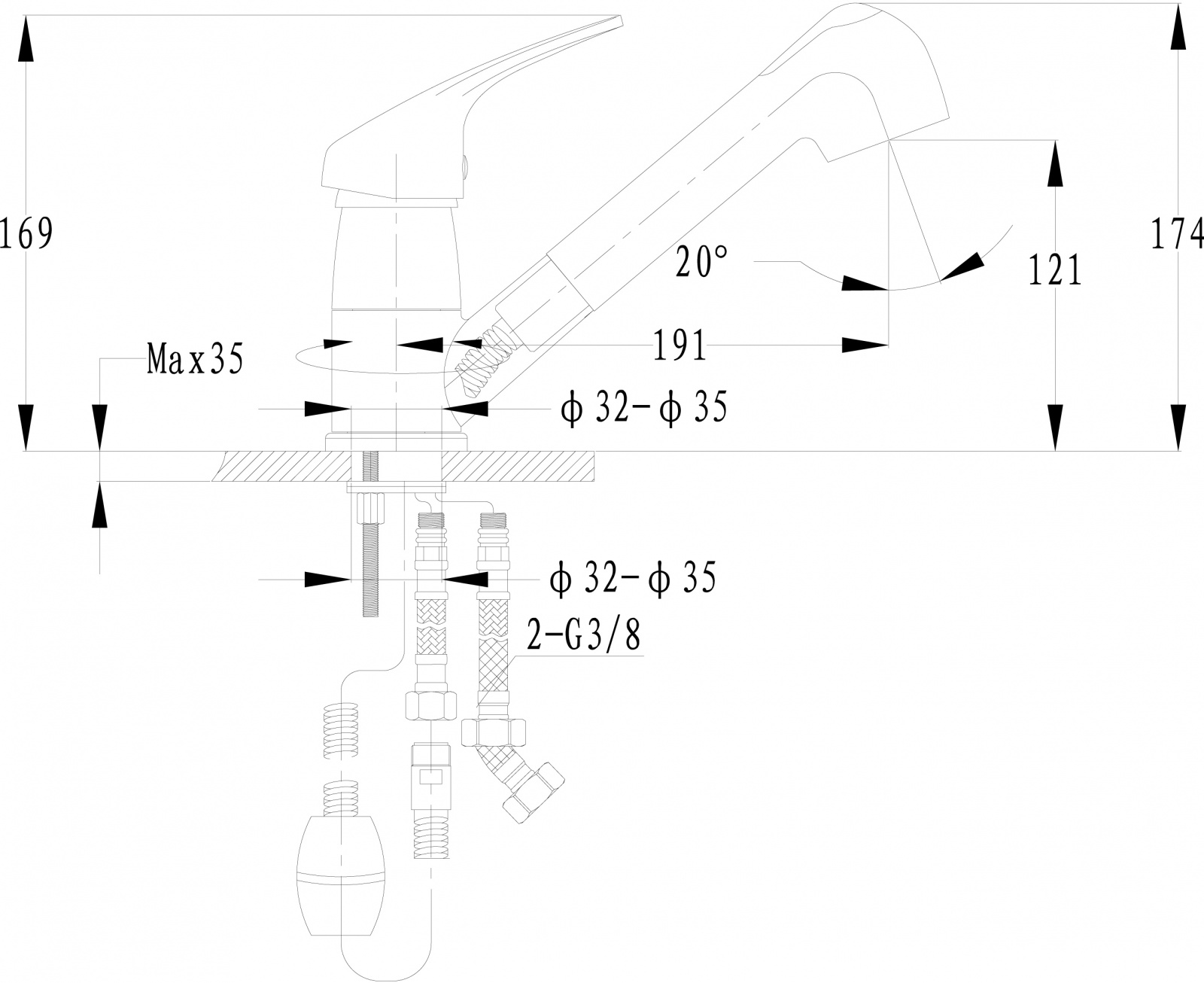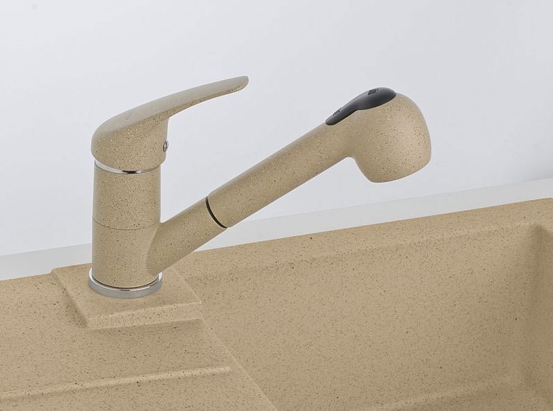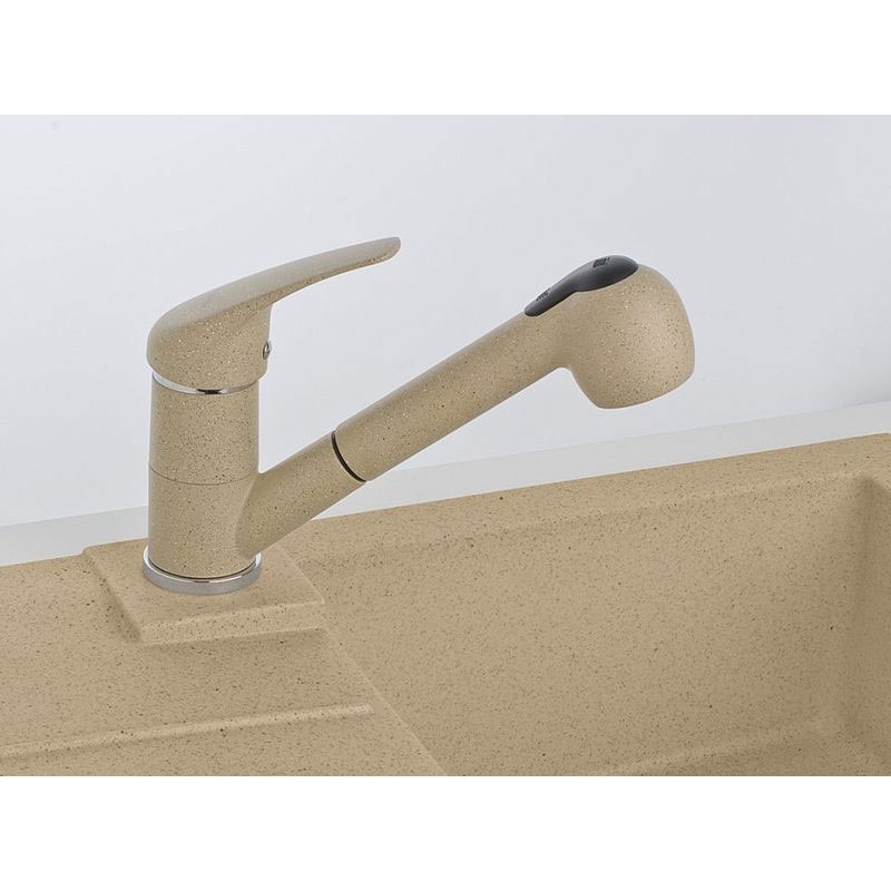 Dřezová otočná páková baterie, béžový granitový povrch, ideální pro použití s dřezy Alveus díky barevné sladěnosti, keramická kartuše s dlouhou životností, vytahovací hlavice s přepínáním sprcha/proud, výška baterie 174 mm, montážní otvor 35 mm, přívodní flexi hadičky o délce 350 celý popis mm součástí balení.