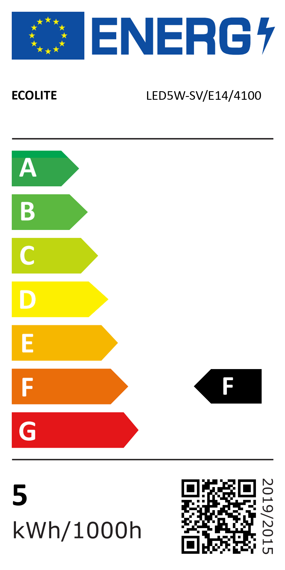 Úsporná LED žárovka, příkon 5 W, patice E14, životnost 30000 hodin, teplota 4100 K, 450 lm, průměr 37 mm, celková délka 103 mm.
