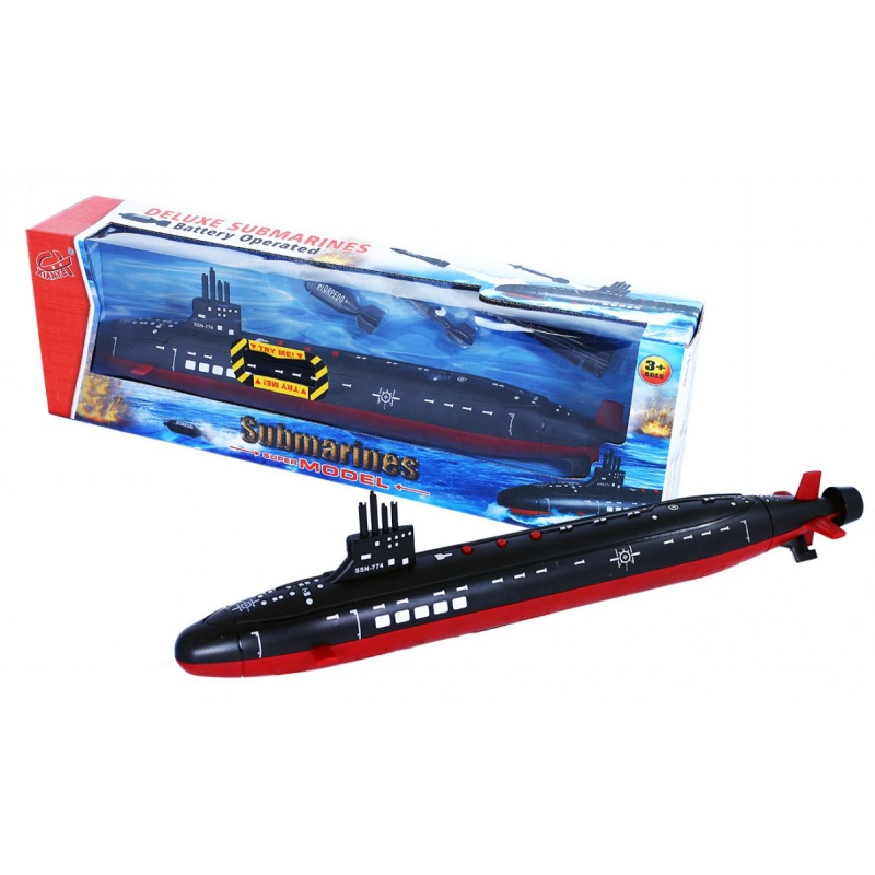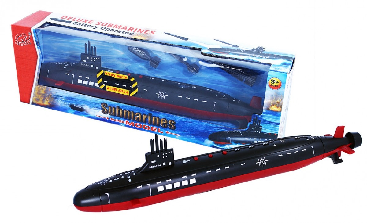 Ponorka se zvukovým efektem. Součástí balení jsou 3 torpéda. 2x baterie LR44 v balení. Stisknutím tlačítek v horní části ponorka vydává reálné zvuky. Vše je vyrobeno z kvalitního PVC. Rozměry ponorky 42,5 x 9,5 cm. Nevhodné pro děti do 3 let.