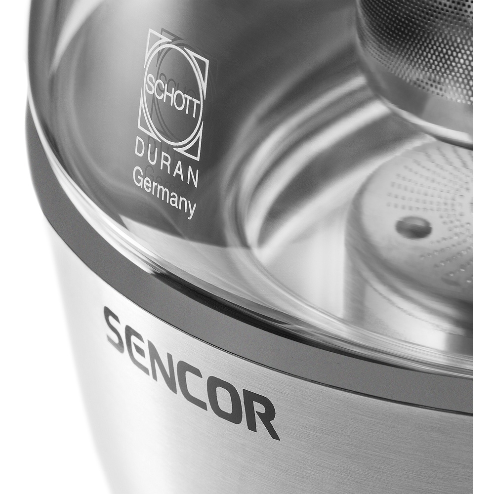 Rychlovarná skleněná konvice o objemu 1,2l, středový konektor, nastavitelná teplota, kontrolka provozu, trojitý bezpečnostní systém, funkce pro udržování teploty, vyjímatelné sítko na čaj z nerezové oceli, vyrobeno z kvalitního žáruvzdorného skla Schott.