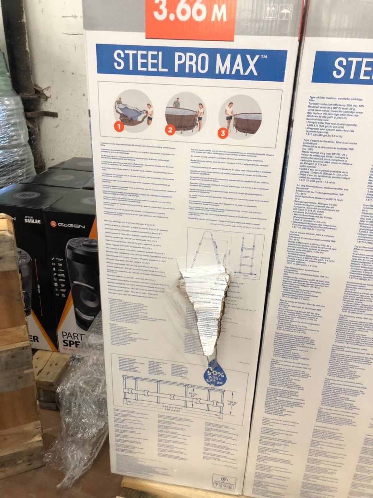 Nadzemní bazén vyroben z trojvrstvého PVC, objem 9 150 litrů, průměr 366 cm, výška 100 cm, bezpečnostní schůdky 107 cm, kartušová filtrace 2006 l/hod