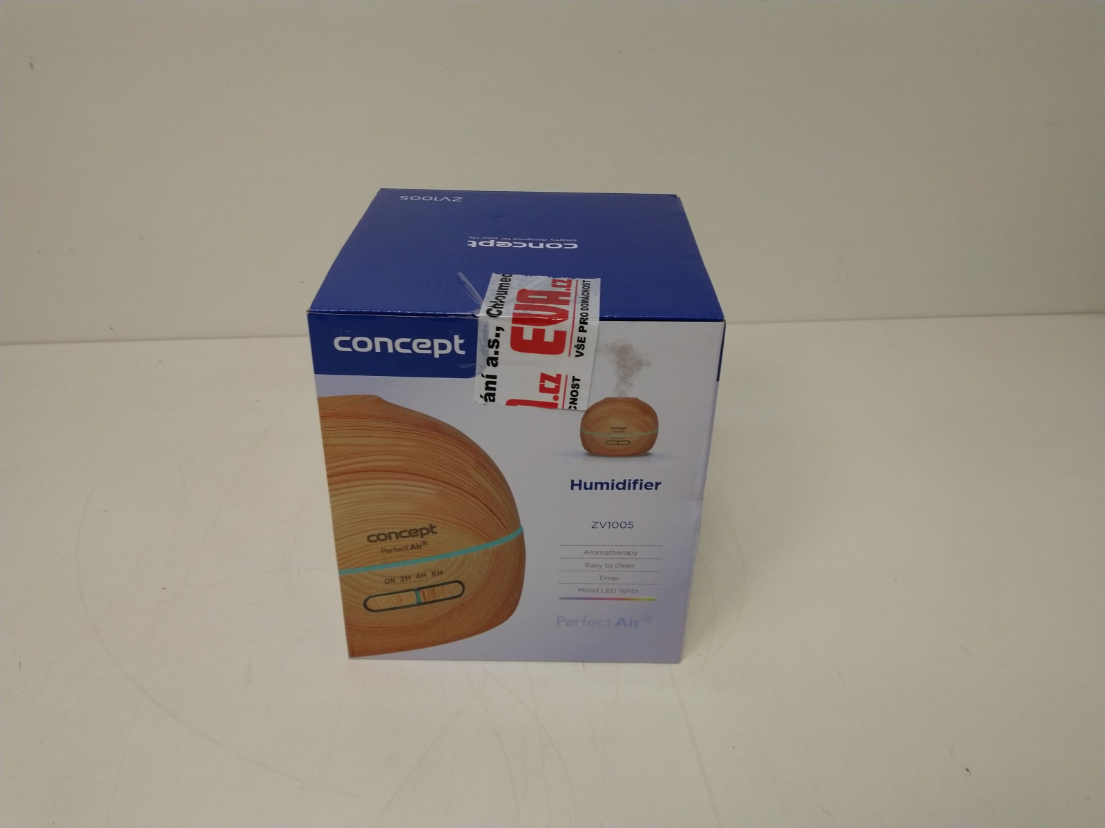 Zvlhčovač vzduchu s aroma difuzérem 2 v 1 Concept ZV1005 Perfect Air, atraktivní design vhodný do moderních prostor, dekorativní aroma difuzér, 2 režimy výkonu, produkce páry na jedno naplnění 12 hodin, vhodné do místnosti velikosti až 15 - 20 m2, max. zvlhčovací výkon: 40 ml/h, celý popisobjem zásobníku na vodu: 300 ml, časovač s možností nastavení 2/4/6 h, automatické vypnutí při nedostatku vody, hlučnost 25 dB, barva světle hnědé dřevo, příkon: 10 W, rozměry: 160 x 160 x 130 mm, hmotnost: 0,55 kg.