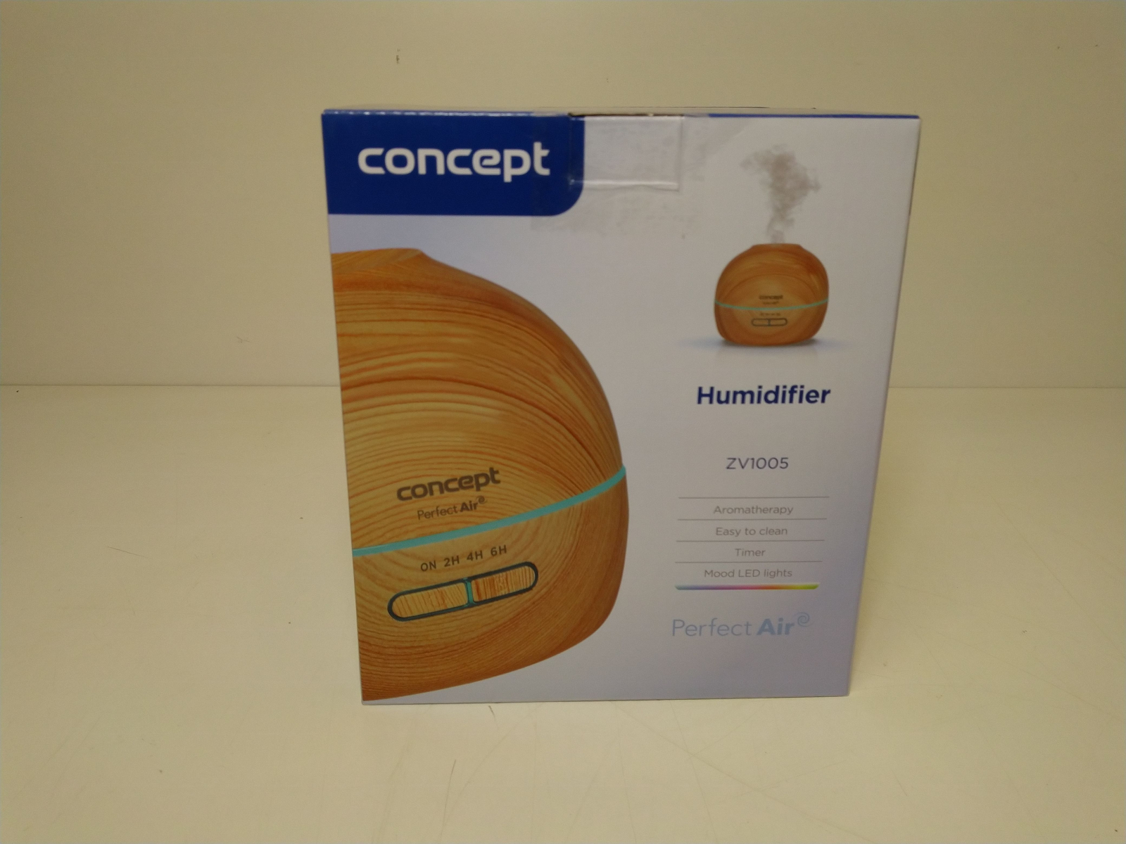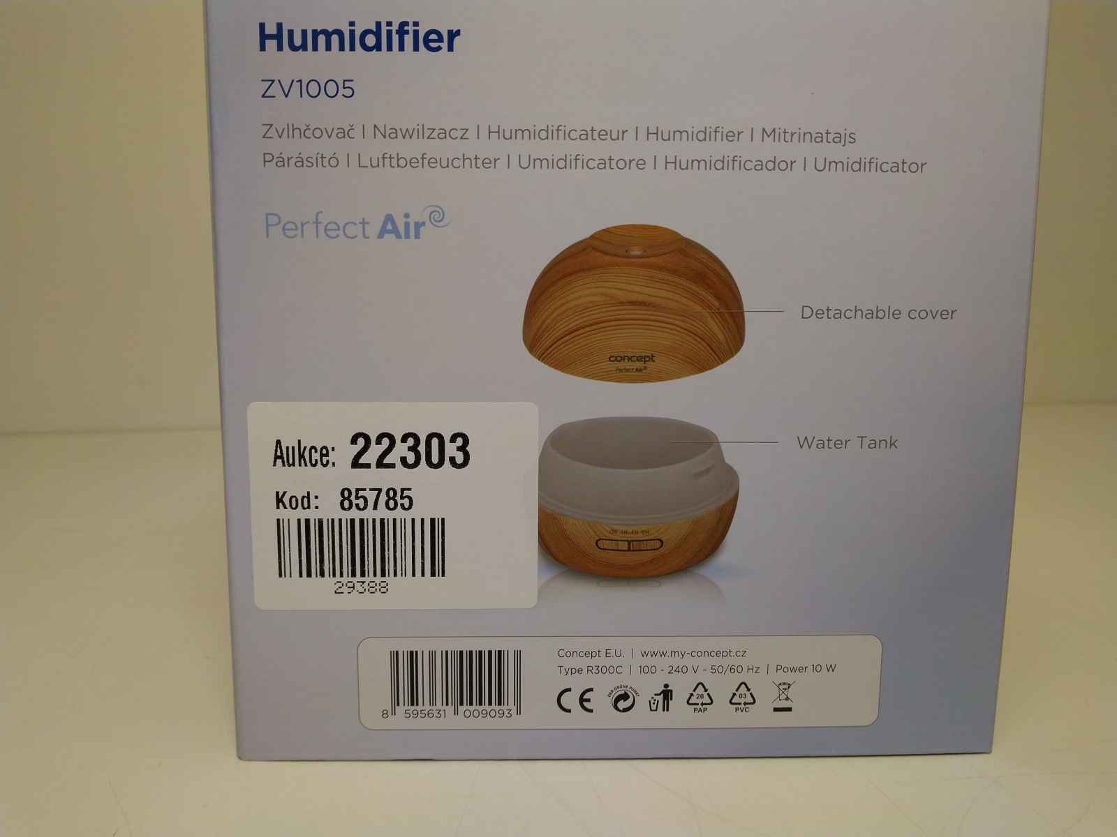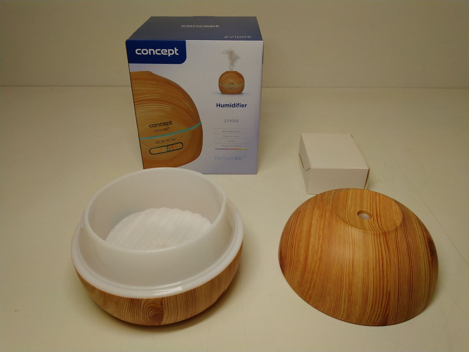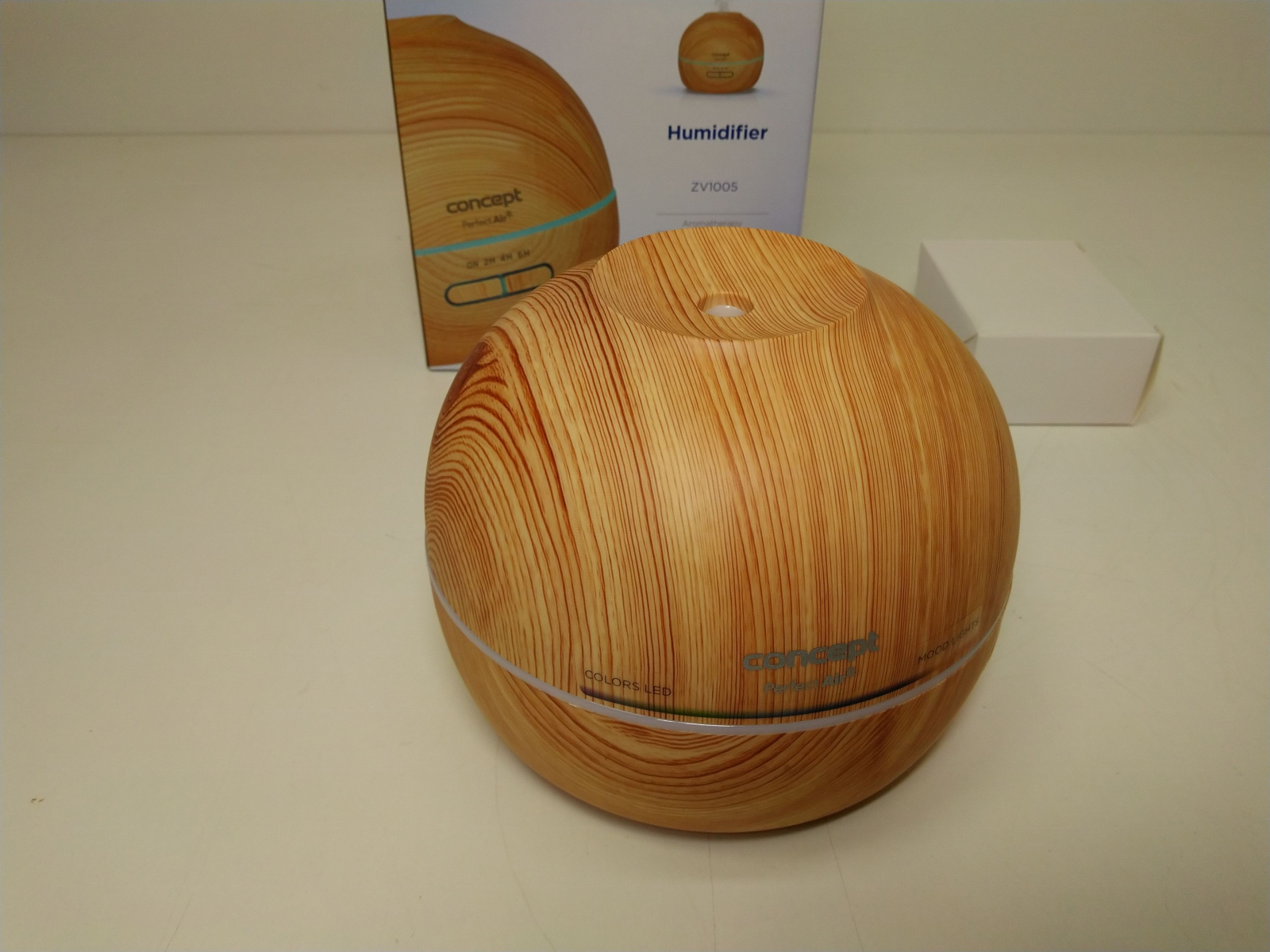 Zvlhčovač vzduchu s aroma difuzérem 2 v 1 Concept ZV1005 Perfect Air, atraktivní design vhodný do moderních prostor, dekorativní aroma difuzér, 2 režimy výkonu, produkce páry na jedno naplnění 12 hodin, vhodné do místnosti velikosti až 15 - 20 m2, max. zvlhčovací výkon: 40 ml/h, celý popisobjem zásobníku na vodu: 300 ml, časovač s možností nastavení 2/4/6 h, automatické vypnutí při nedostatku vody, hlučnost 25 dB, barva světle hnědé dřevo, příkon: 10 W, rozměry: 160 x 160 x 130 mm, hmotnost: 0,55 kg.