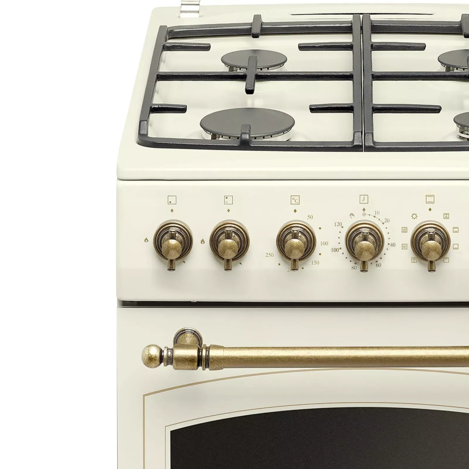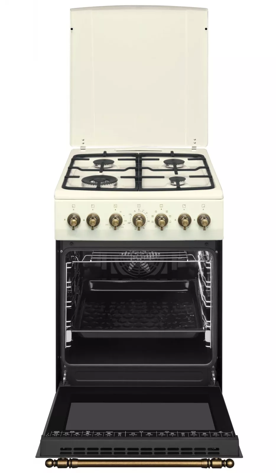 Kombinovaný sporák s multifunkční horkovzdušnou troubou v retro designu, energetická třída A, objem 65 litrů, 4 plynové hořáky s pojistkou plamene, litinové mřížky, 2 skla ve dveřích trouby, minutka, teleskopický výsuv, funkce rozmrazování, příslušenství: 1 hluboký smaltovaný ple celý popisch, rošt, příklop varné desky, trysky na PB