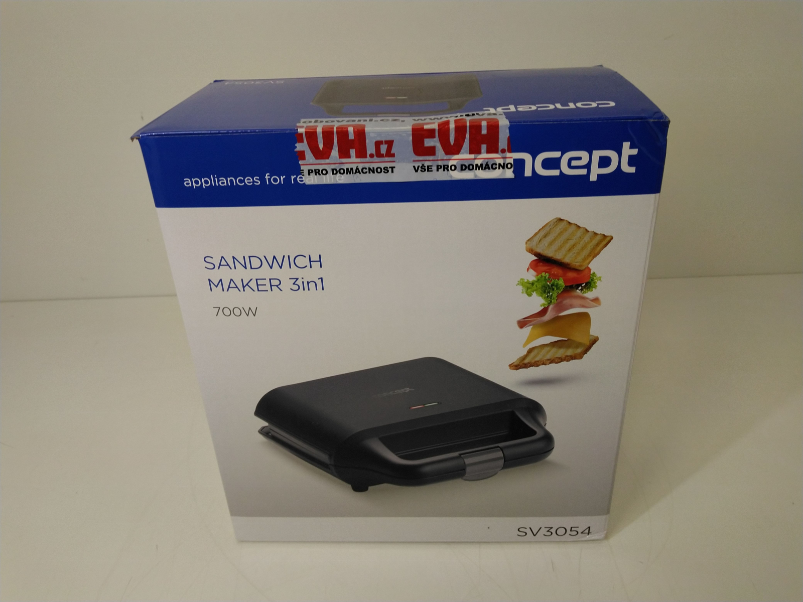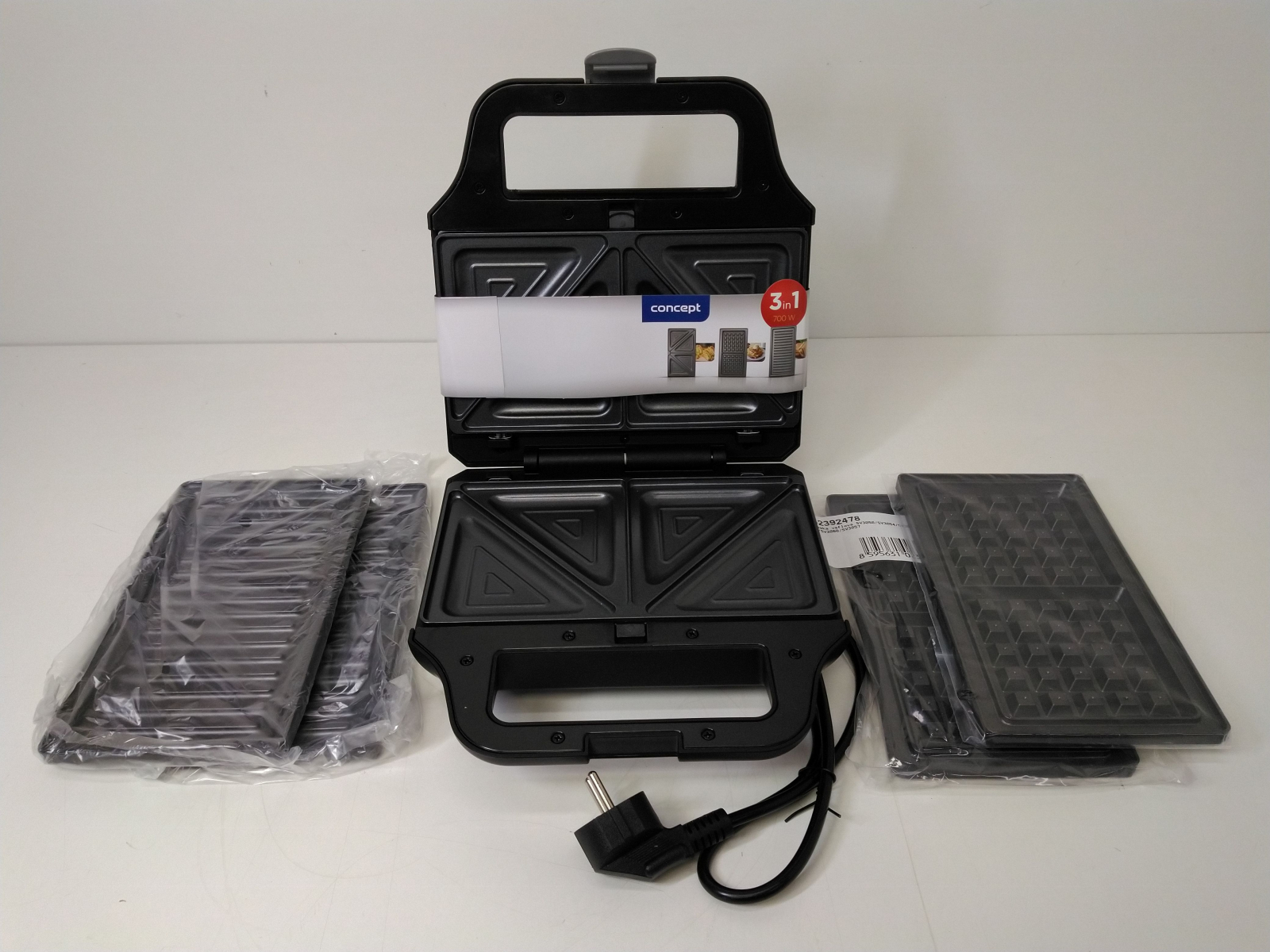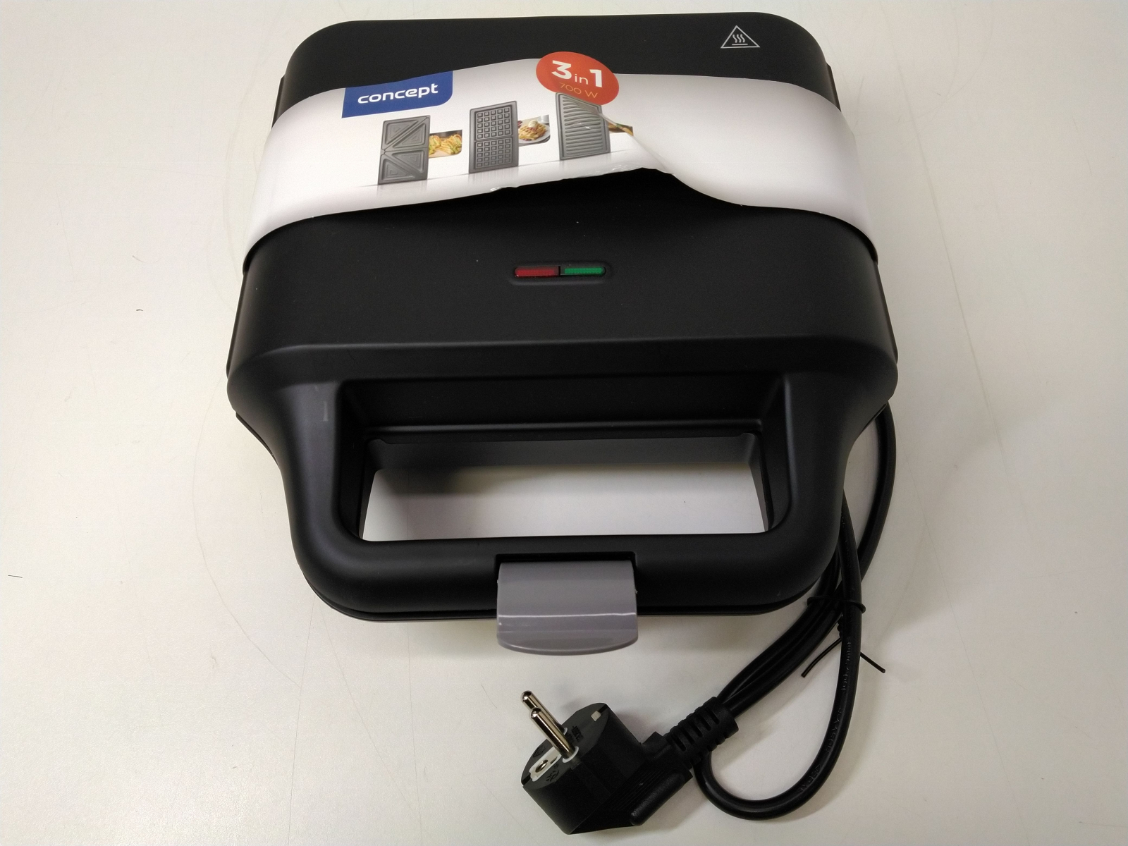 Sendvičovač 3v1, výměnné desky na pečení, trojúhelníkový tvar sendviče, panini, vafle, nepřilnavý povrch pro snadné čištění, plotny lze mýt v myčce nádobí, tepelně izolovaná rukojeť, indikátor provozu a nahřátí, délka napájecího kabelu 70 cm, automatická regulace teploty.