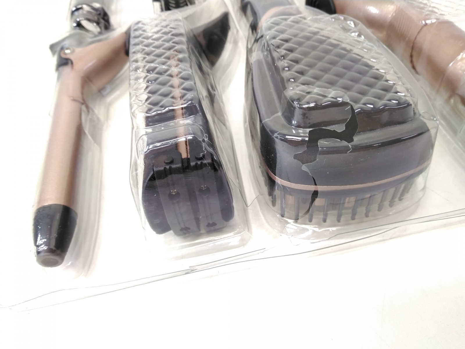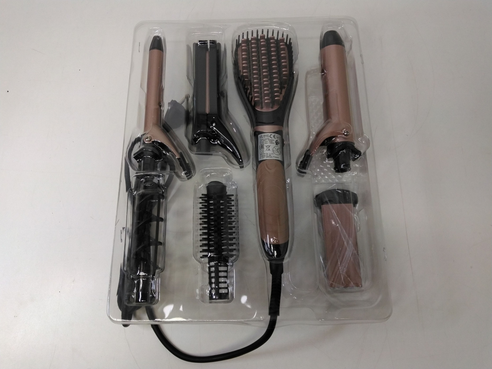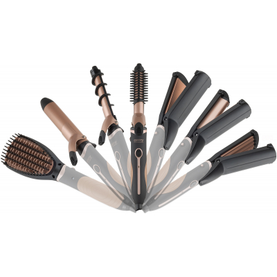 Sada na úpravu vlasů 7 v 1 kombinuje klasickou kulmu s nástavci na lokny, kartáč, kleště u kterých máte další 3 vyměnitelné desky: krepovací, rovné plochy a na větší vlny. Nástavce jsou s nepřilnavým keramickým povrchem. Menší kulma má průměr 19 mm se spirálovým vedením, větší ku celý popislma má průměru 32 mm, otočná šňůra, maximální příkon 1200 W.