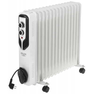 Olejový radiátor, 15 článků, 3 stupně výkonu 1000/1500/2500 W, plynulá regulace teploty, ochrana proti přehřátí, rozměry (š x v x h): 635 x 550 x 240 mm, indikace zapnutí, kolečka pro snadné přemístění, délka přívodního kabelu 1,48 m, barva bílá, napětí 220 - 240 V, hmotnost 9,54 celý popis kg. Tento výrobek je vhodný pouze pro dobře izolované prostory nebo občasné používání.
