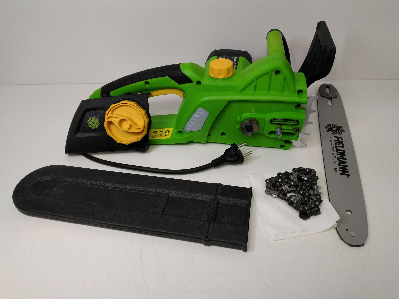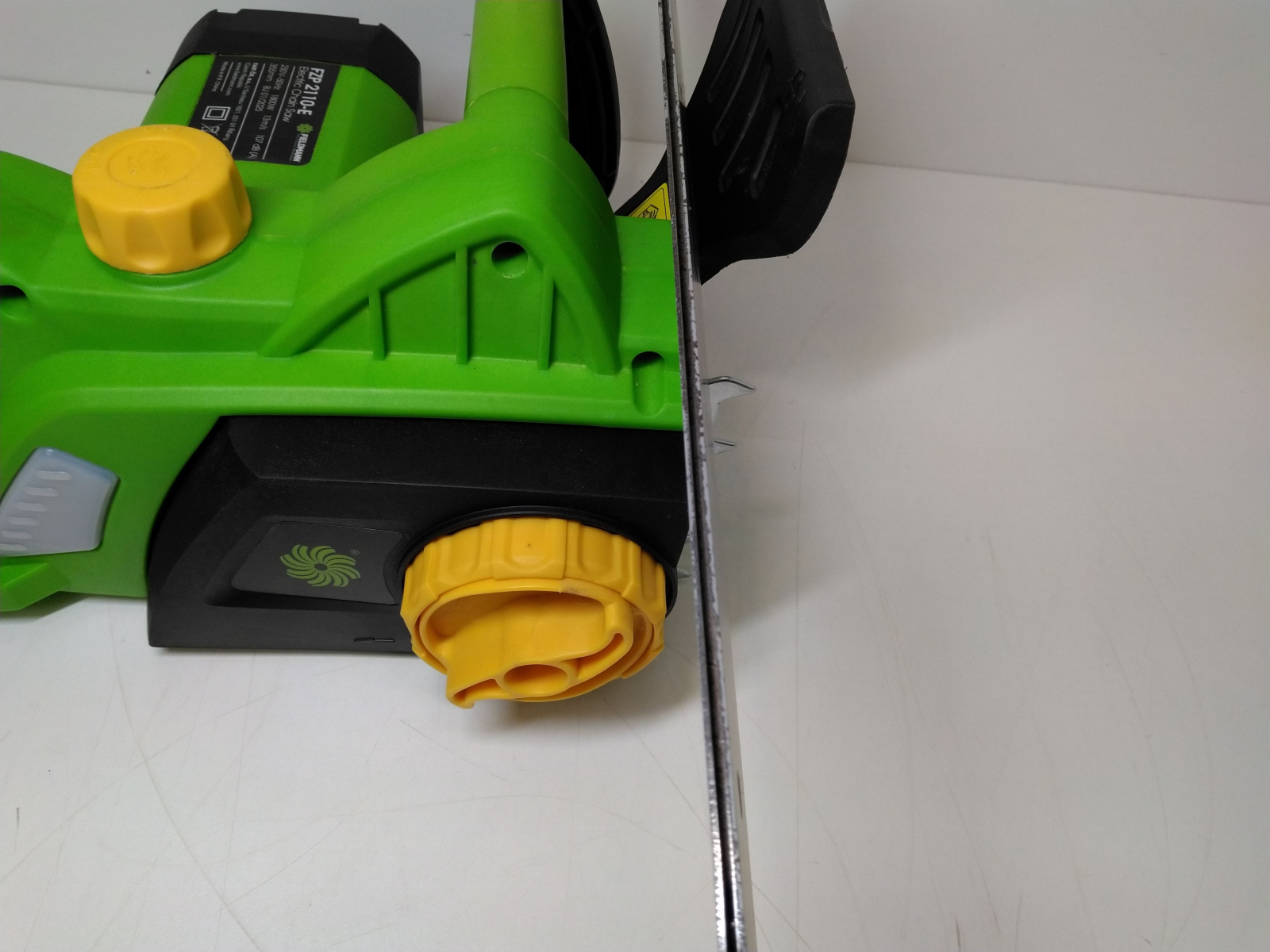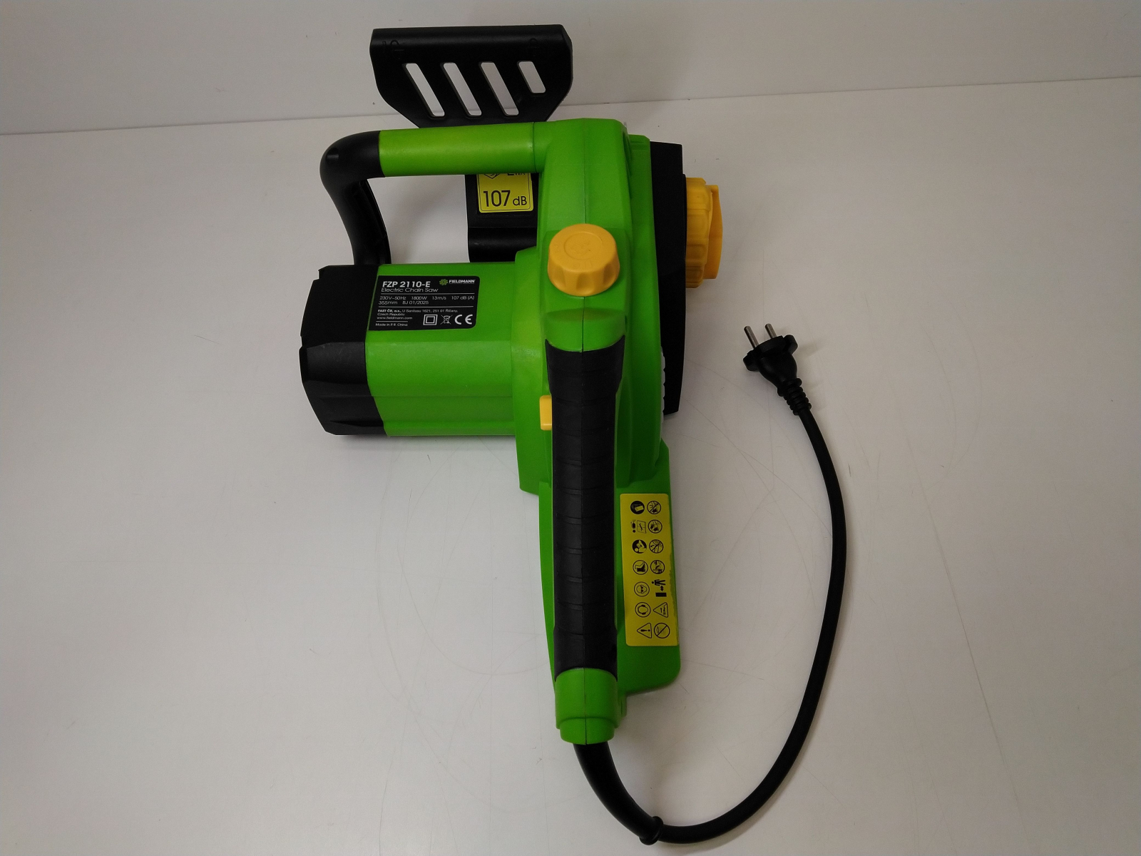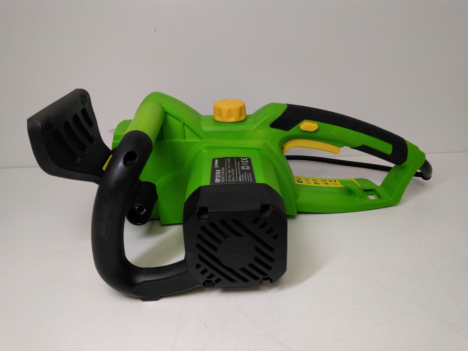 Elektrická řetězová pila, příkon 1800 W, lišta 14"/355 mm, rychloupínací systém lišty a řetězu bez použití nářadí, bezpečnostní brzda řetězu, automatická olejová pumpa pro mazání lišty a řetězu, olejová nádrž 110 ml, řezná rychlost 13 m/s, dělení řetězu 3/8", počet článků řetězu celý popis52, šíře řetězové drážky 1.3 mm.