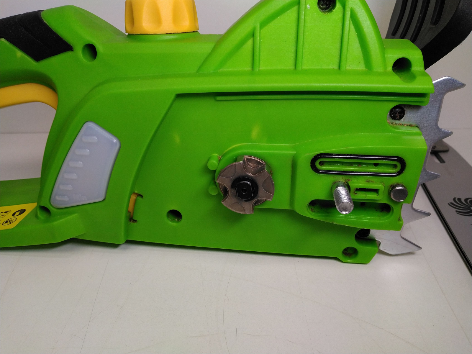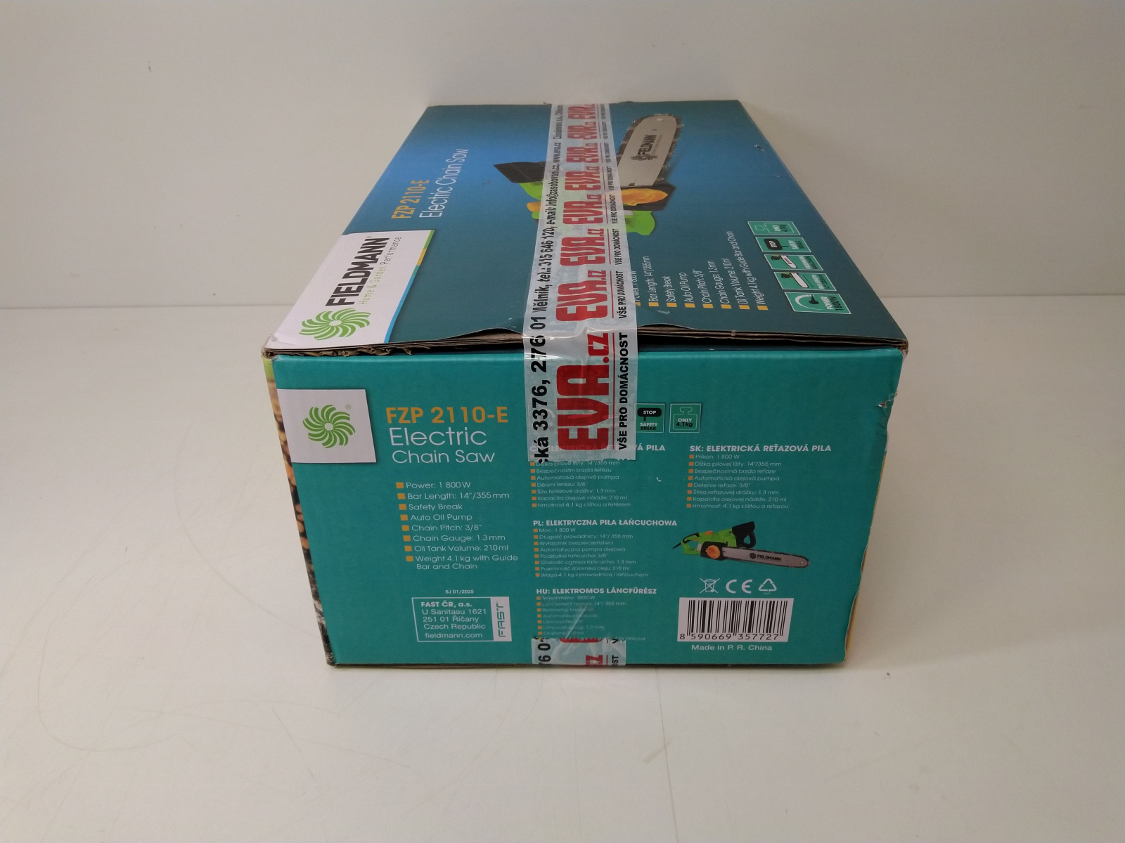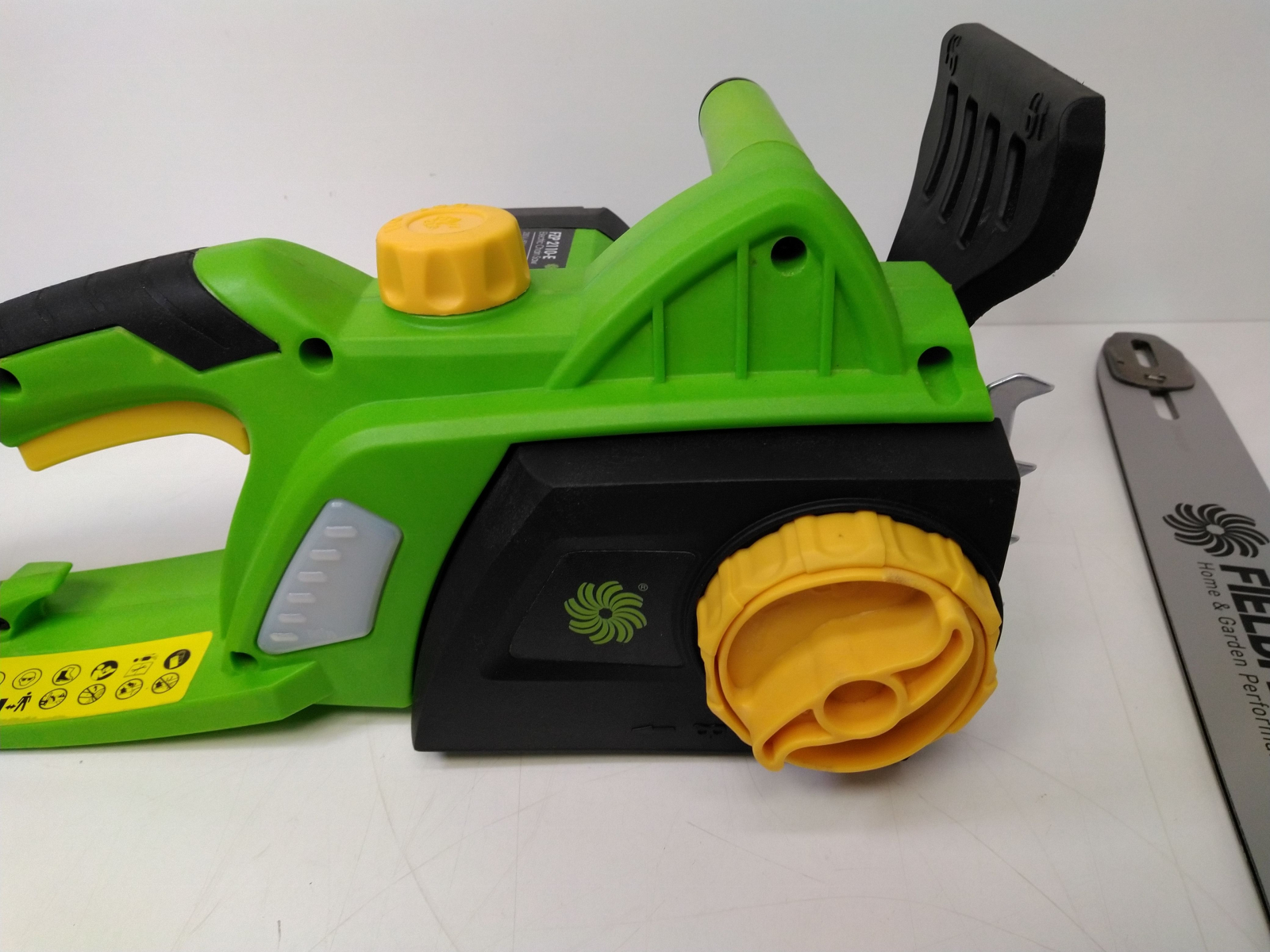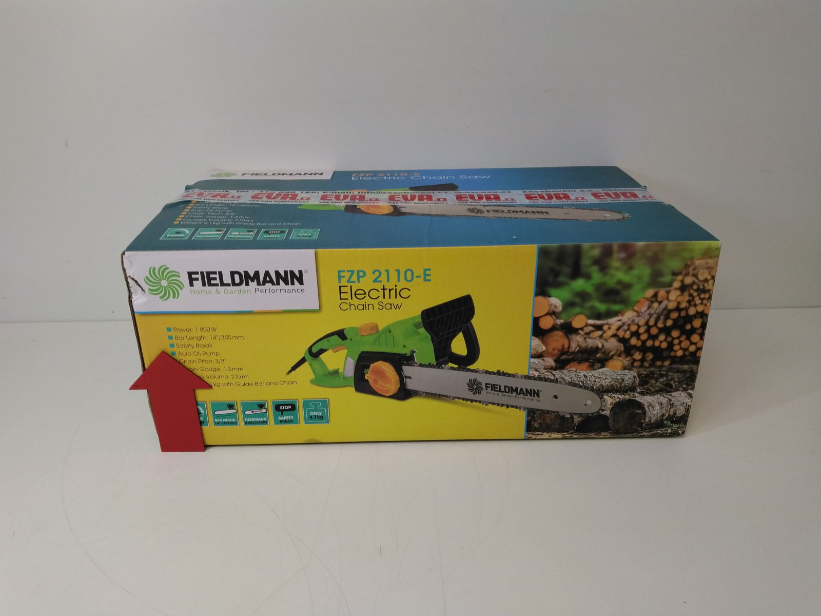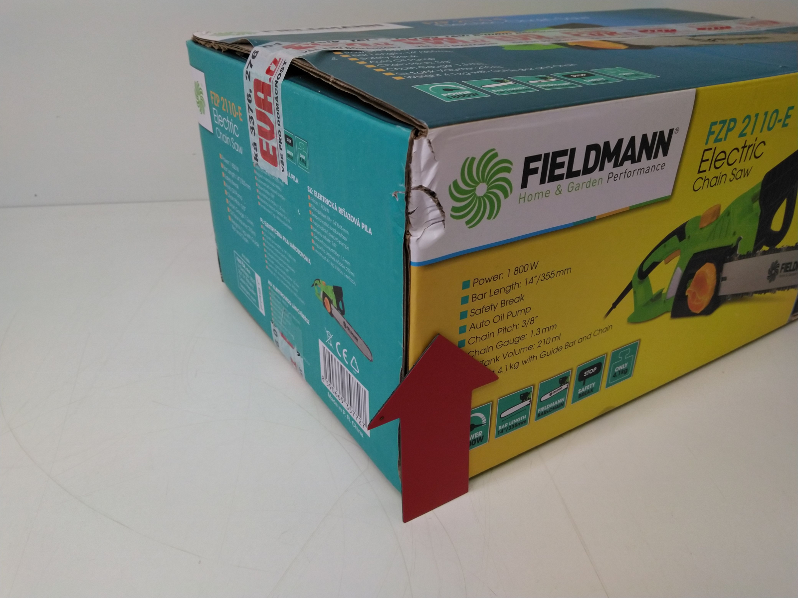 Elektrická řetězová pila, příkon 1800 W, lišta 14"/355 mm, rychloupínací systém lišty a řetězu bez použití nářadí, bezpečnostní brzda řetězu, automatická olejová pumpa pro mazání lišty a řetězu, olejová nádrž 110 ml, řezná rychlost 13 m/s, dělení řetězu 3/8", počet článků řetězu celý popis52, šíře řetězové drážky 1.3 mm.