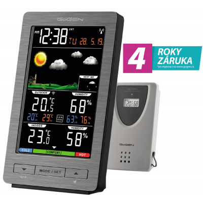 Meteorologická stanice s bezdrátovým snímačem. Barevný LCD displej. Nastavitelná intenzita podsvícení displeje. Čas řízen rádiovým signálem DCF 77, předpověď počasí, vnitřní teplota a vlhkost, venkovní teplota a vlhkost, max a min venkovní teploty a vlhkosti, alarm pro venkovní t celý popiseplotu, datum, budík. Přenos dat ze senzoru na frekvenci 433 MHz, dosah senzoru otevřeném prostoru až 50 metrů. Předpověď počasí s animací pro slunečno, polojasno, oblačno, zataženo s deštěm, mráz nebo sněžení. Vnitřní teplota: -10°C až +50°C, venkovní teplota: -20°C až +50°C. Vlhkost vzduchu: 20% až 99%. Napájení: Hlavní jednotka - síťovým adaptérem 230V (součástí balení) nebo 2 x baterie AA (nejsou součástí balení), teplotní senzor - 2 x baterie AAA (nejsou součástí balení). Rozměry: hlavní jednotka (š x v x h): 93 x 153 x 45 mm, čidlo (š x v x h): 62 x 100 x 20 mm. Barva šedá.