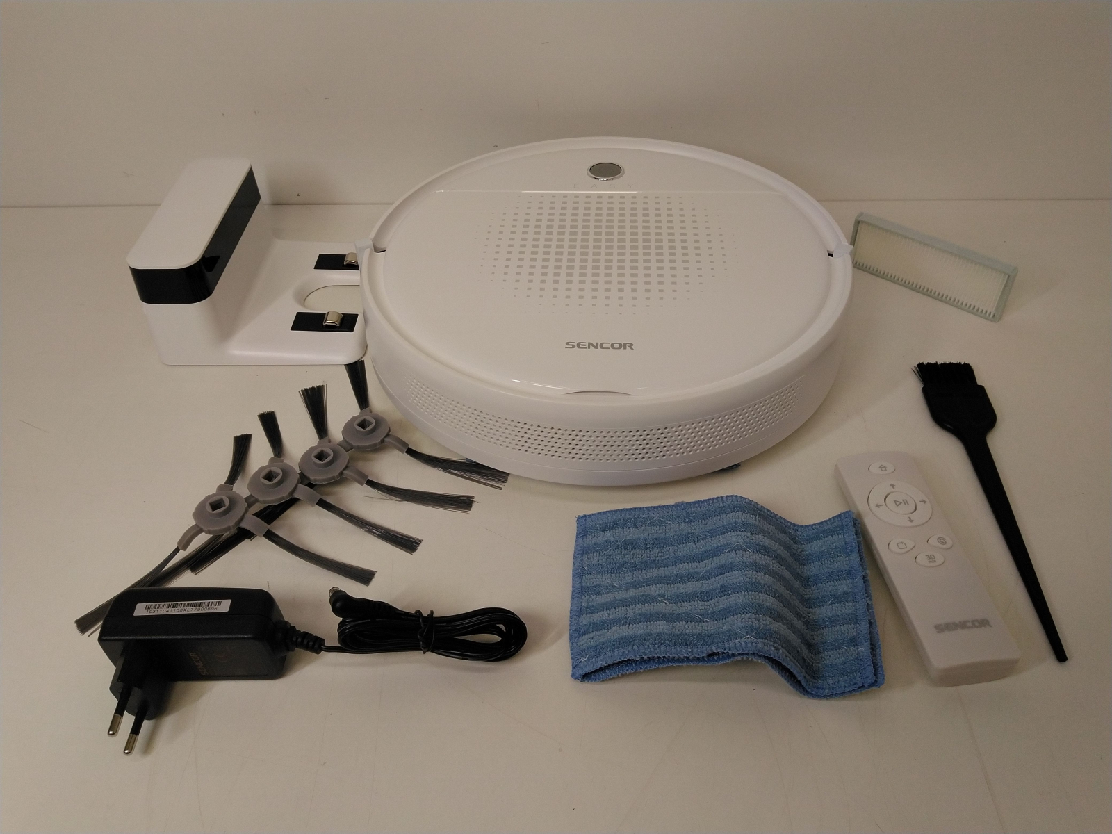 Robotický vysavač, vysává a stírá zároveň, ovládání pomocí dálkového ovladače nebo tlačítkem na samotném vysavači. Sencor Smart Room pro inteligentní pohyb v prostoru. Vysává a mopuje zároveň. Senzory proti nárazu a pádu. 1500 mAH 11,1 V Li-Ion baterie, doba provozu 60 min, nabíj celý popisení cca 5 hod. Obsah balení: robotický vysavač včetně dvou bočních kartáčů a filtrů, nabíjecí stanice, 3× textilní mopovací návlek (antistatická utěrka), dálkový ovladač, 2× AAA baterie, 2× náhradní boční rotační kartáč, síťový adaptér, 1× náhradní HEPA filtr, čisticí kartáček. Hmotnost 1,9 kg, rozměry (š x v x h): 290 x 70 x 290 mm.