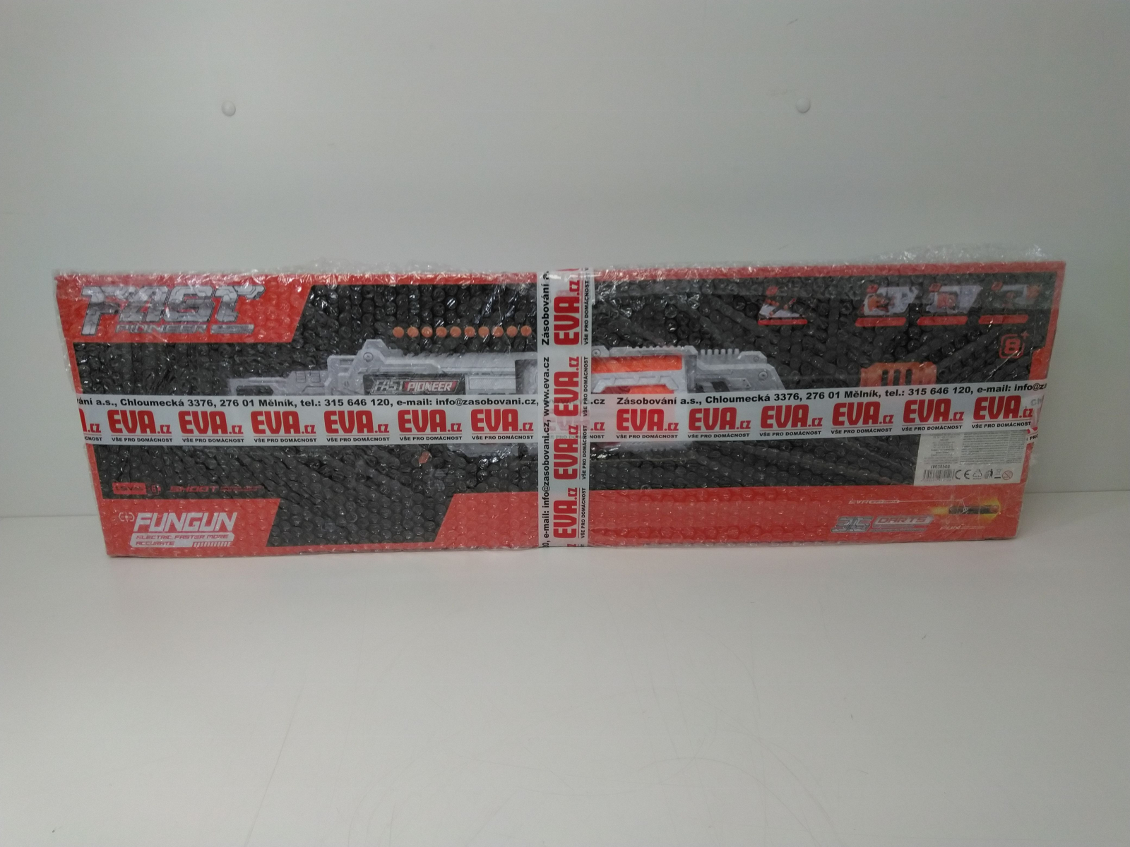 Elektrická puška s rotačním zásobníkem, který se automaticky otočí po výstřelu, zbraň není potřeba natahovat. Součástí je 36 pěnových nábojů. Rozměry 82 x 22 x 6 cm. Napájení 6 x AA, baterie nejsou součástí. Odkládací prostor pro 10 nábojů v horní části pušky. Nevhodné pro děti d celý popiso 3 let.