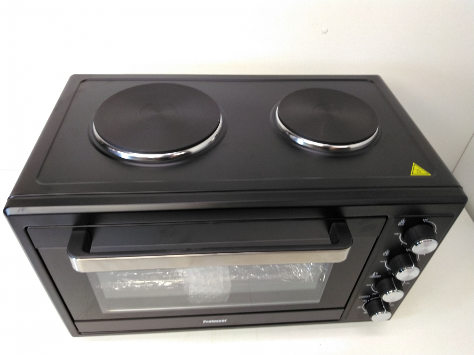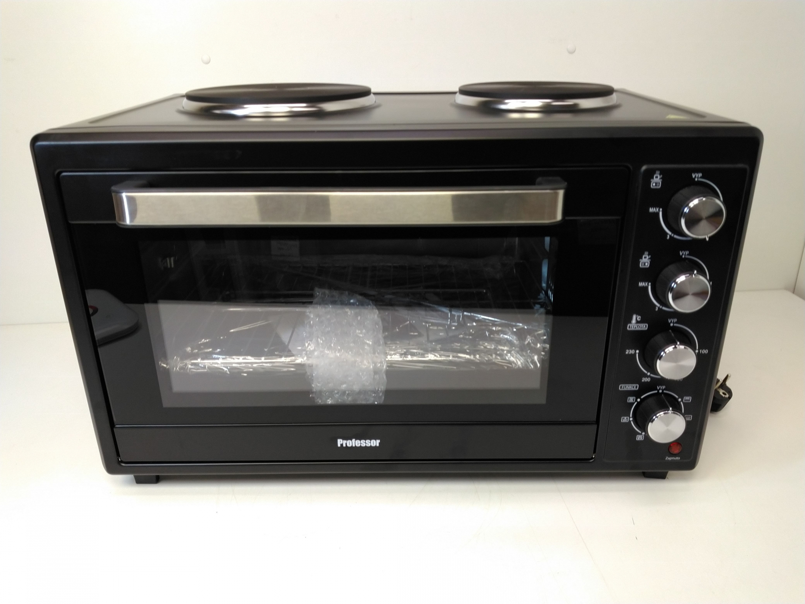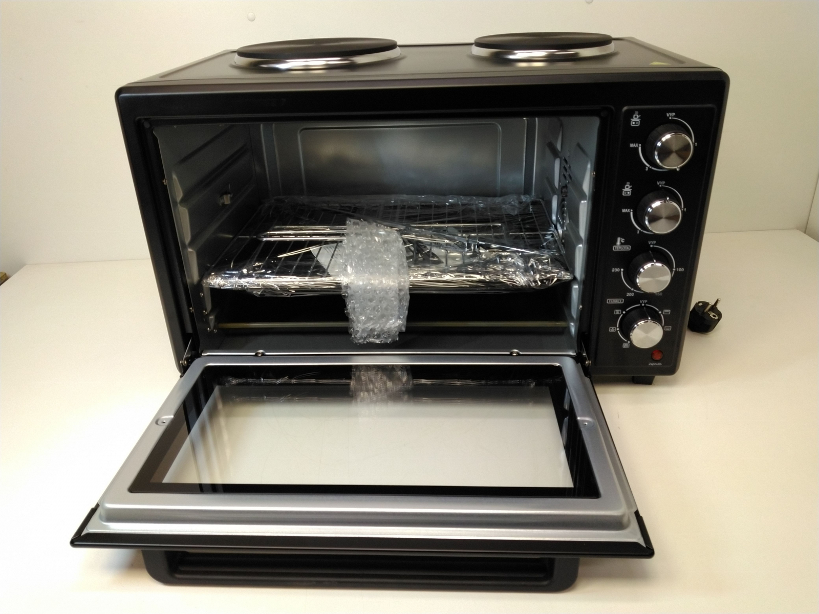 Elektrická trouba, objem 45 litrů, příkon trouby 1800 W, 2 litinové plotny s regulací výkonu, levá plotýnka 185 mm s příkonem 1000 W, pravá plotýnka 155 mm s příkonem 600 W, gril, otočný rožeň, ventilátor pro proudění vzduchu při pečení, nastavení teploty 100°C - 230°C, vnitřní o celý popissvětlení, příslušenství: rošt, rožeň, pečící plech, hmotnost 11,7 kg, vnější rozměry (š x v x h): 580 x 400 x 380 mm, vnitřní rozměry (š x v x h): 437 x 294 x 305 mm, délka přívodní šňůry 95 cm.