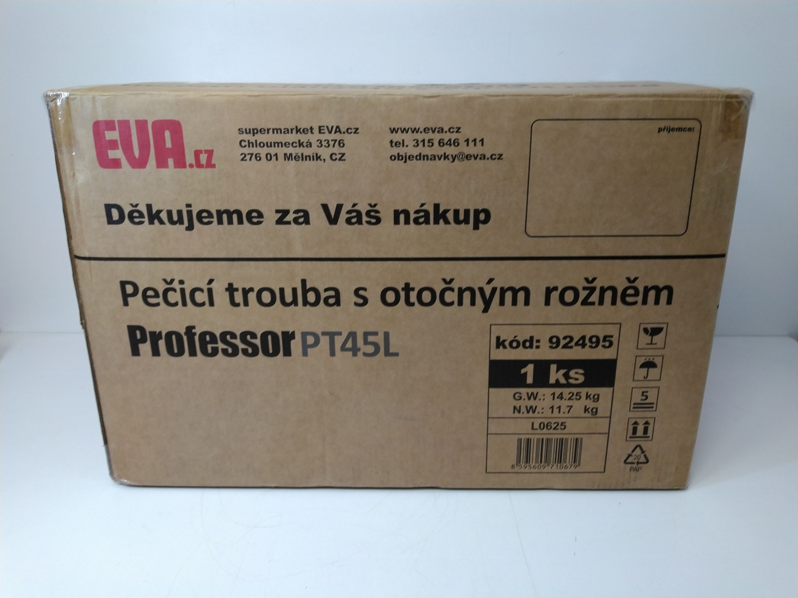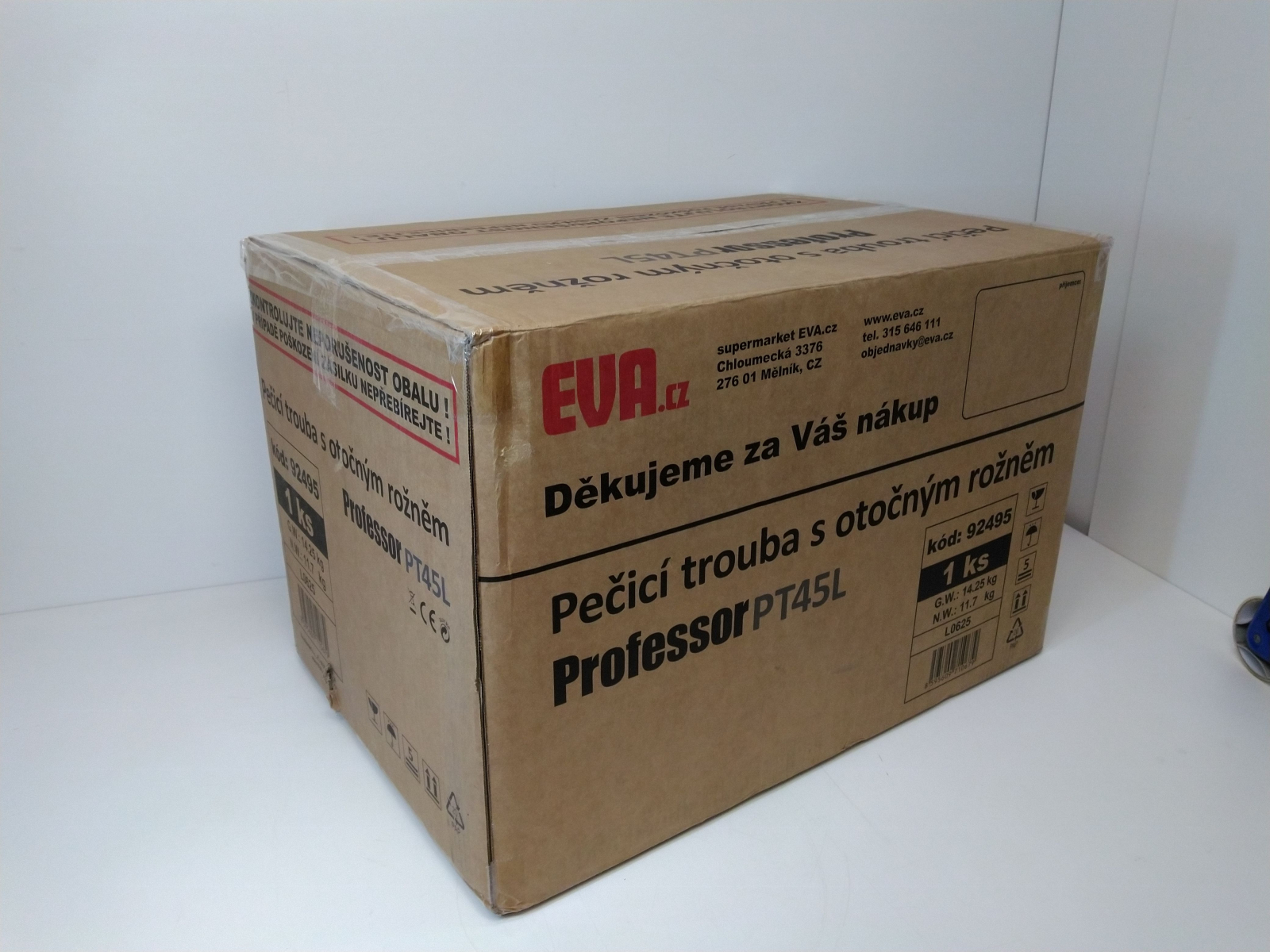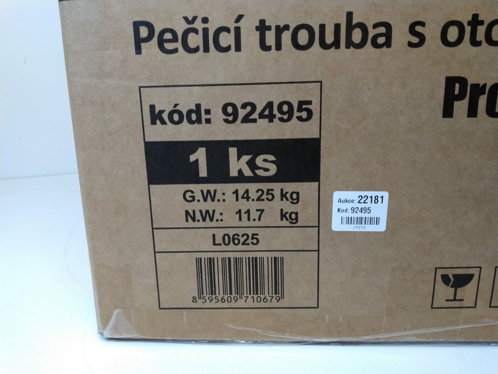 Elektrická trouba, objem 45 litrů, příkon trouby 1800 W, 2 litinové plotny s regulací výkonu, levá plotýnka 185 mm s příkonem 1000 W, pravá plotýnka 155 mm s příkonem 600 W, gril, otočný rožeň, ventilátor pro proudění vzduchu při pečení, nastavení teploty 100°C - 230°C, vnitřní o celý popissvětlení, příslušenství: rošt, rožeň, pečící plech, hmotnost 11,7 kg, vnější rozměry (š x v x h): 580 x 400 x 380 mm, vnitřní rozměry (š x v x h): 437 x 294 x 305 mm, délka přívodní šňůry 95 cm.