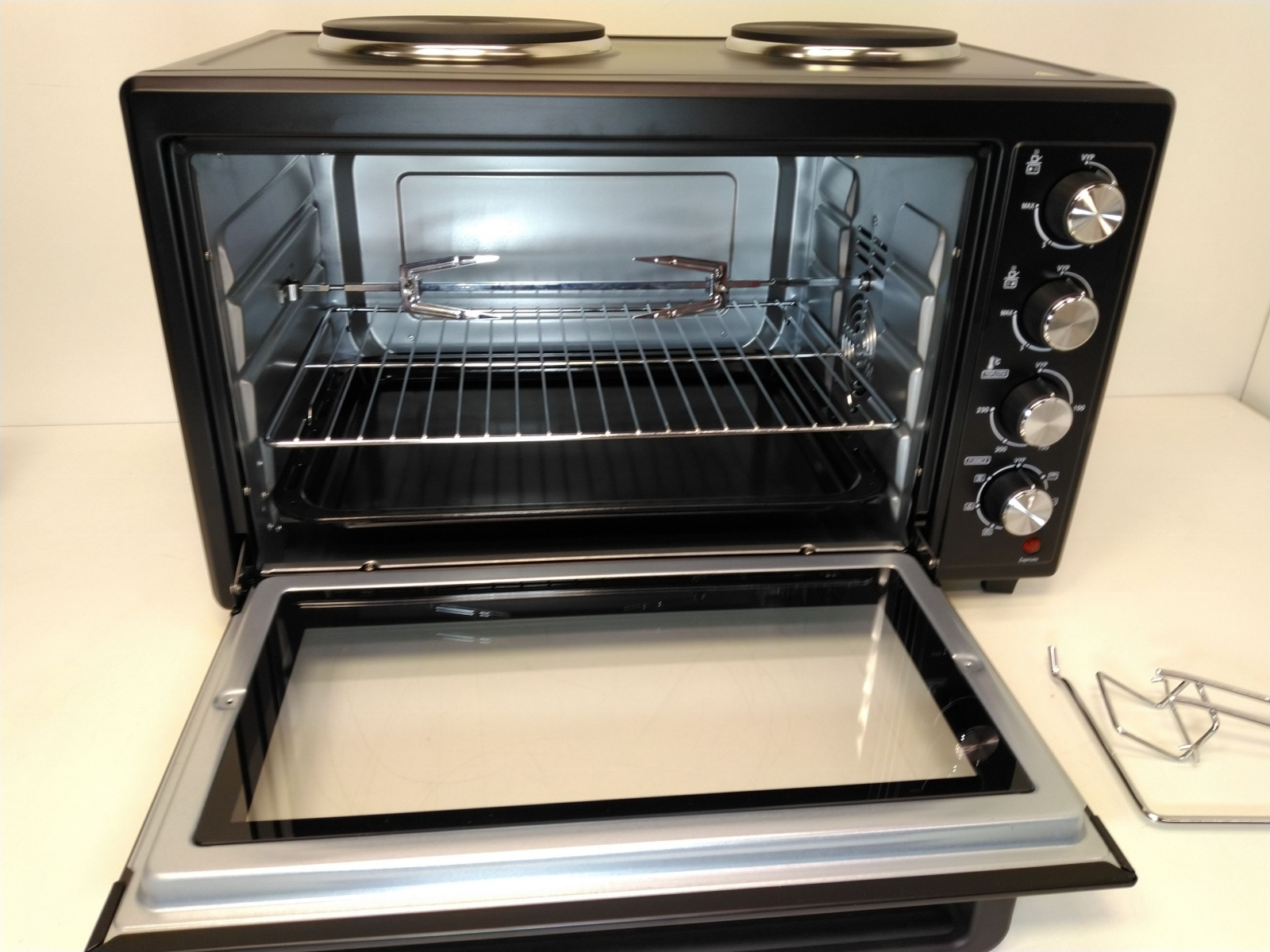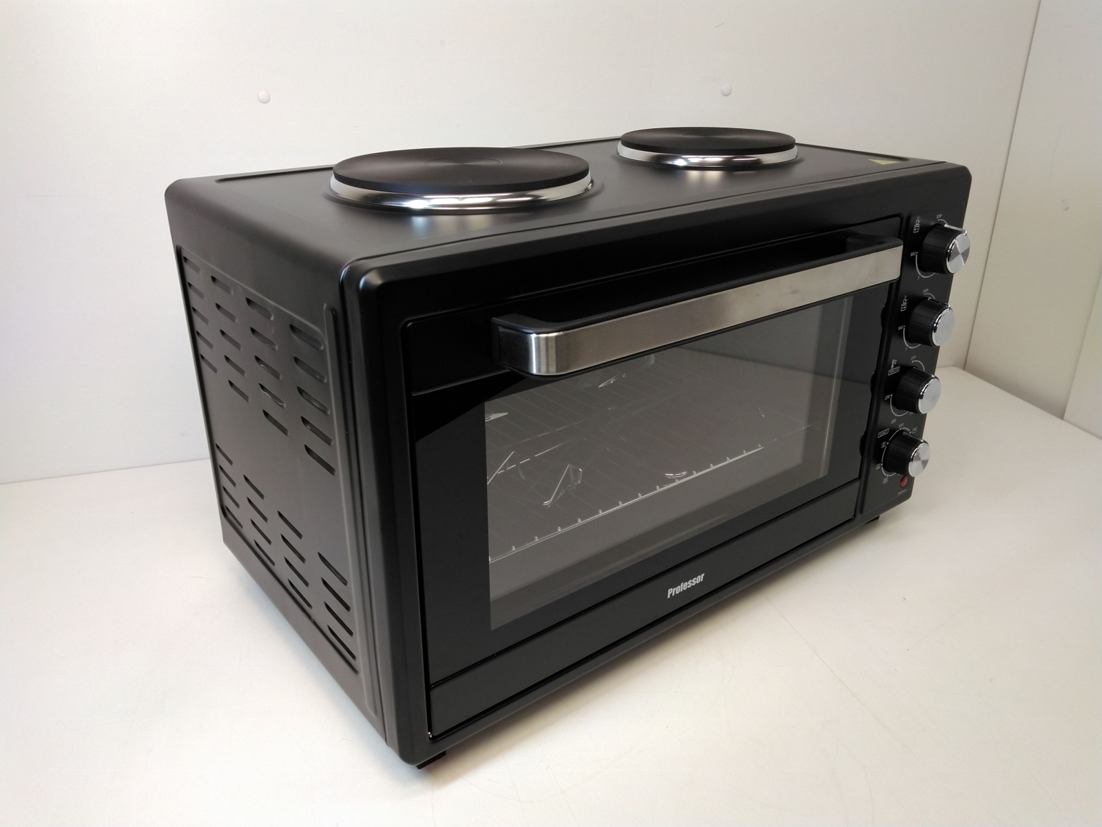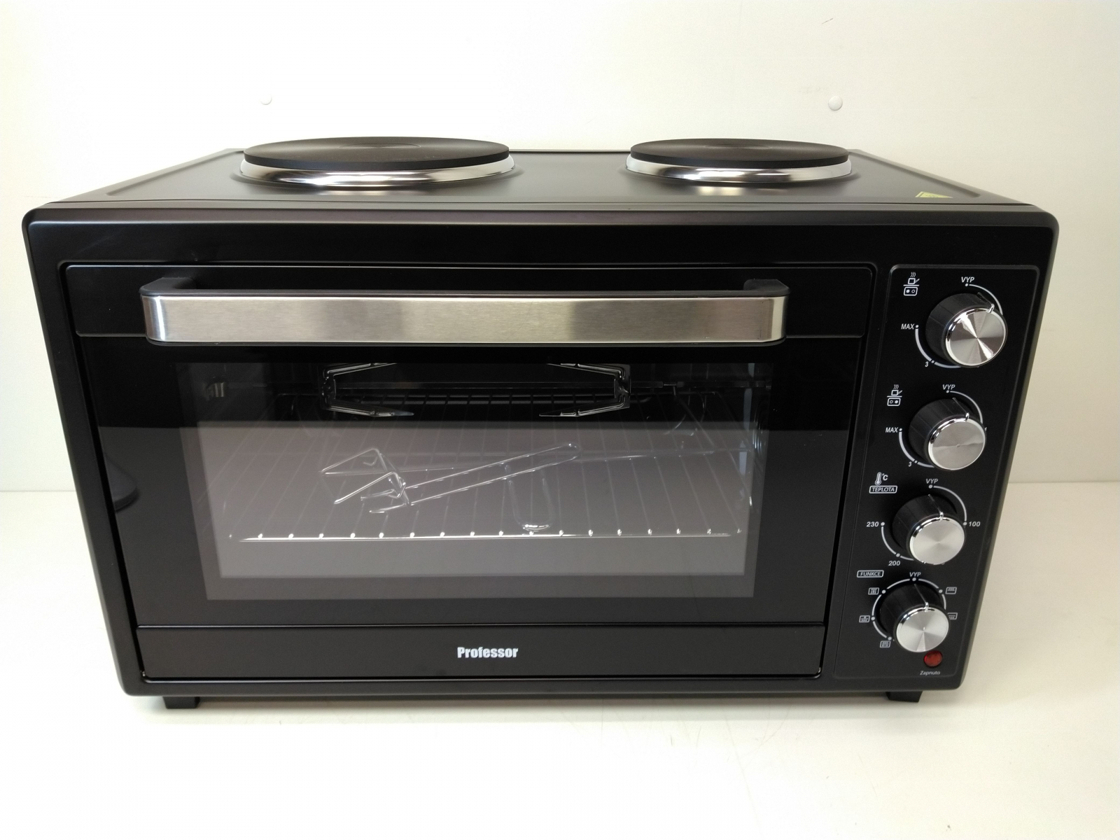 Elektrická trouba, objem 45 litrů, příkon trouby 1800 W, 2 litinové plotny s regulací výkonu, levá plotýnka 185 mm s příkonem 1000 W, pravá plotýnka 155 mm s příkonem 600 W, gril, otočný rožeň, ventilátor pro proudění vzduchu při pečení, nastavení teploty 100°C - 230°C, vnitřní o celý popissvětlení, příslušenství: rošt, rožeň, pečící plech, hmotnost 11,7 kg, vnější rozměry (š x v x h): 580 x 400 x 380 mm, vnitřní rozměry (š x v x h): 437 x 294 x 305 mm, délka přívodní šňůry 95 cm.