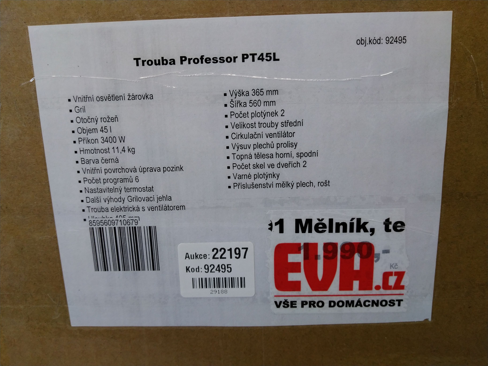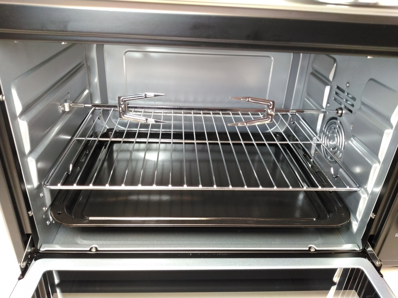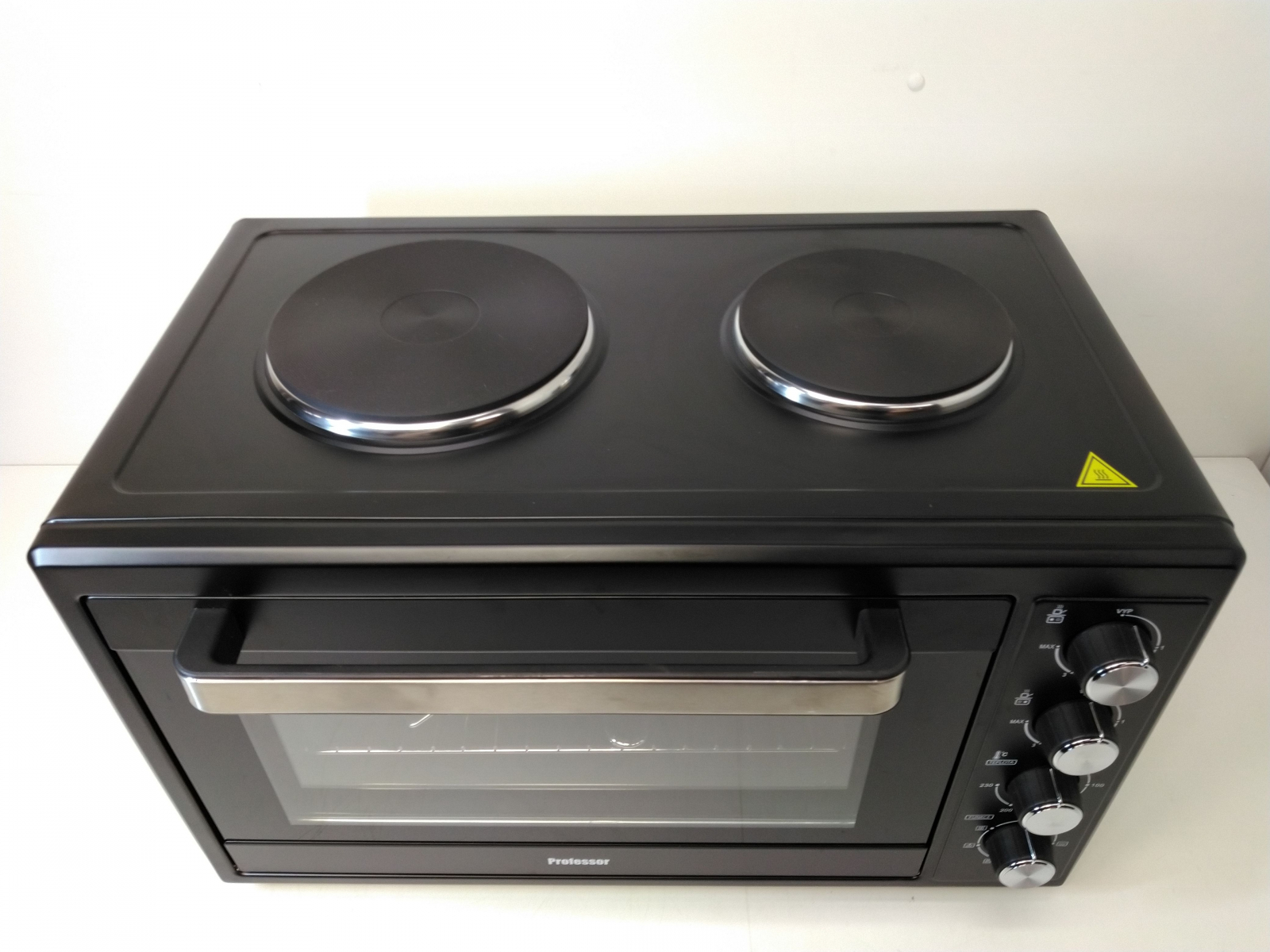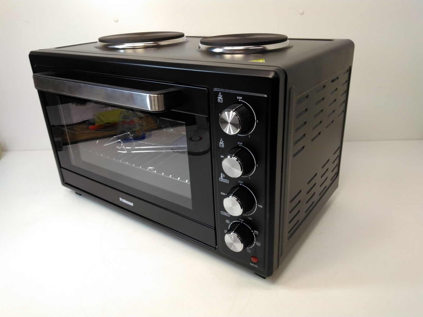 Elektrická trouba, objem 45 litrů, příkon trouby 1800 W, 2 litinové plotny s regulací výkonu, levá plotýnka 185 mm s příkonem 1000 W, pravá plotýnka 155 mm s příkonem 600 W, gril, otočný rožeň, ventilátor pro proudění vzduchu při pečení, nastavení teploty 100°C - 230°C, vnitřní o celý popissvětlení, příslušenství: rošt, rožeň, pečící plech, hmotnost 11,7 kg, vnější rozměry (š x v x h): 580 x 400 x 380 mm, vnitřní rozměry (š x v x h): 437 x 294 x 305 mm, délka přívodní šňůry 95 cm.