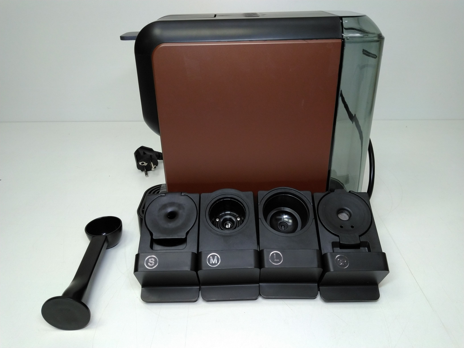 Multifunkční kávovat na kapsle a mletou kávu. Tlak čerpadla 15 bar. Tři velikosti přihrádky na kapsle: S - velikost Nespresso kapsle, M - velikost Tchibo kapsle, L - velikost Nescafé Dolce Gusto kapsle. Možnost použití i mleté kávy. Volba velikosti šálku (malý, střední, velký). N celý popisahřívání 30 sec., automatické vypnutí. Nádržka na vodu 0,8 l. Přívodní kabel 75 cm. Rozměry (š x v x h): 120 x 280 x 300 mm. Box na příslušenství není součístí balení.