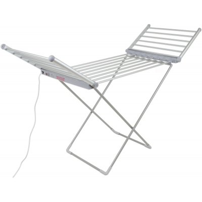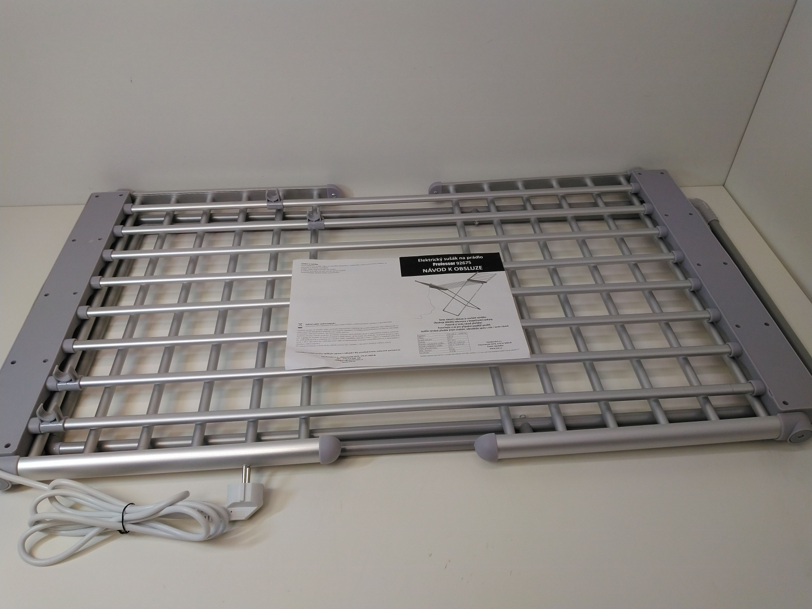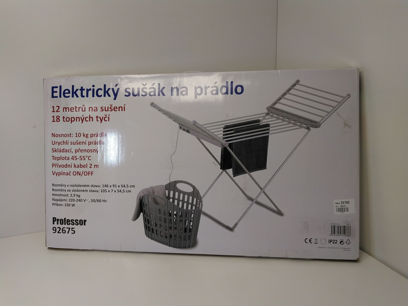 Elektrický sušák na prádlo Professor pomáhá urychlit sušení prádla díky 18 vyhřívaným tyčím. Celková délka tyčí je 12 metrů a nosnost sušáku je cca 10 kg prádla. Je určený pro vnitřní použití. Hodí se zejména do menších bytů, pro rychlé sušení prádla v chladných a deštivých dnech celý popis atp. Lze jej také používat jako běžný sušák, bez připojení k elektrické síti. Sušák je lehký a snadno složitelný. Lze jej jednoduše přemisťovat. Složený sušák nezabere moc místa, můžete jej umístit za dveře, do skříně, pod postel apod. Teplota vyhřívaných tyčí je 45°-55°C. Jednoduché ovládání tlačítkem ON/OFF. Rozměry v rozloženém stavu: 146 x 91 x 54,5 cm, ve složeném stavu: 105 x 7 x 54,5 cm hmotnost: 2,9 kg, délka napájecího kabelu 2 m, Krytí IP22 pro vnitřní použití, příkon 230 W.