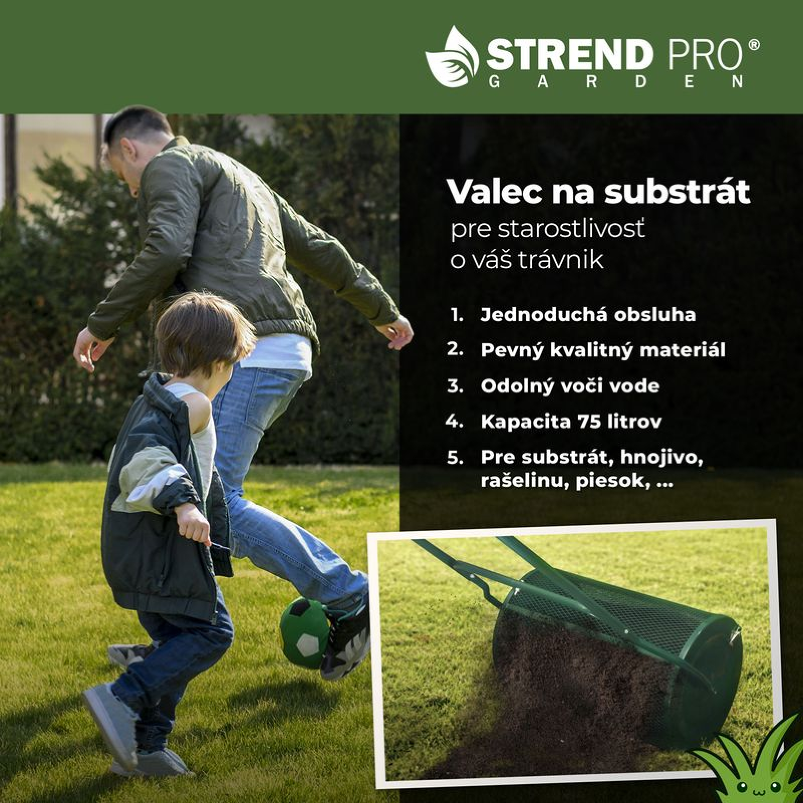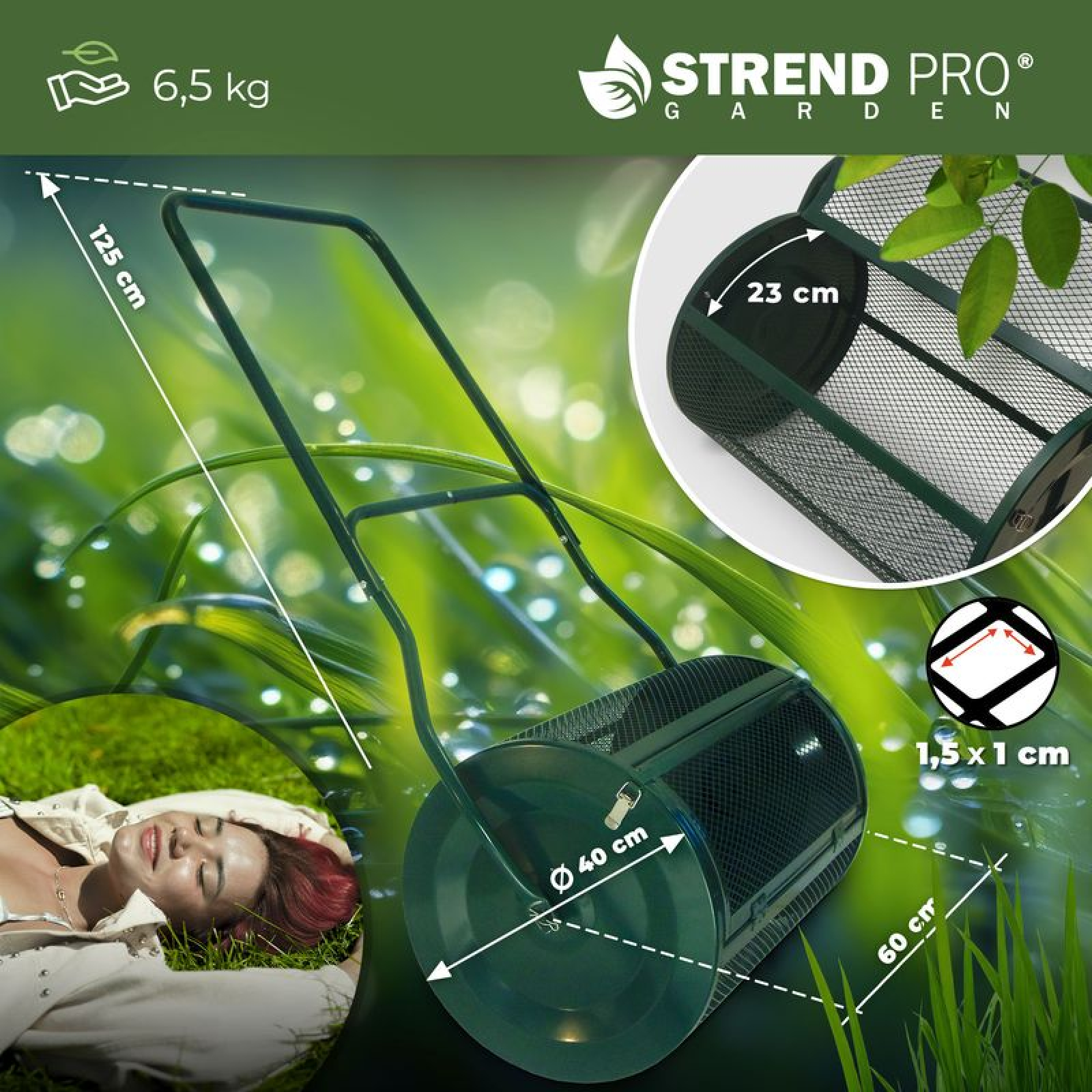Prosévací travní válec pro rovnoměrné a efektivní rozložení substrátu. Usnadňuje zakládání, vyrovnávání a údržbu trávníku, překrytí semen po výsevu. Rovnoměrně rozprostírá a prosévá substrát, kompost, písek nebo zeminu. Je ideální pro péči o anglický trávník. Zachytává kameny a v celý popisětší nečistoty, přičemž jemnější část substrátu nebo kompostu rovnoměrně propouští, velikost oka je 1 x 1,5 cm. Umožňuje snadnou práci na větších plochách s minimální námahou a s větším množstvím substrátu. Pracovní záběr válce 60 cm, průměr 40 cm, objem 75 l. Délka i s madlem 125 cm. Nízká hmotnost 6,5 kg.
