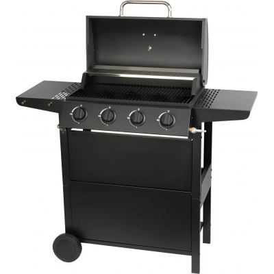 Plynový gril pro menší a středně velké grilovací párty či rodinné oslavy obslouží až 12 osob. Má smaltovaný grilovací rošt (67 × 30,5 cm) a druhý vyklápěcí rošt (58 × 10 cm). Nabízí komfortní grilování díky 4 výkonným hořákům z nerezavějící oceli výkonu 10 kW s krytem a odtokem n celý popisa tuk, což minimalizuje přepalování. Snadné piezo zapalování je integrováno v otočných knoflících. Gril má zabudovaný teploměr ve víku, dva odkládací stolky, háčky na zavěšení grilovacího náčiní, otvírák na lahve, úložný prostor pod grilovací vanou a pojezdová kolečka. Rozměry Š x H x V 116 x 50 x 100 cm. Součástí balení NENÍ plynová hadice a regulátor pro přípojení 5 či 10 kg LPG lahve, které lze dokoupit.