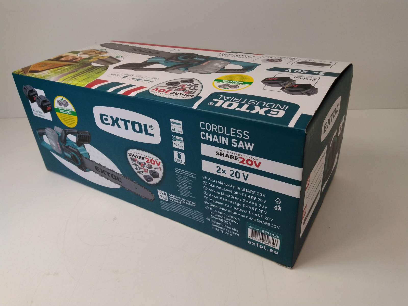 Akumulátorová řetězová pila s dlouhou 45cm lištou, vč. dvou akumulátorů 20V/4000 mAh a dvojité nabíječky, bezuhlíkový „brushless" motor s vyšší účinností než běžné motory s uhlíkovými kartáči, ochranná clona na ruce s bezpečnostní pojistkou pro rychlé zastavení řetězu, robustní k celý popisovový doraz, automatické mazání řetězu, nádrž oleje 150 ml s průhledem pro kontrolu hladiny, pro výměnu nebo napnutí řetězu není potřeba žádný nástroj, rychlost řetězu 14,3 m/s, otvor v těle pily pro zavěšení na zeď. Dodáváno vč. 2 baterií s ukazatelem stavu nabití a nabíječky systému Extol SHARE 20V, které lze použít i pro další výrobky této řady. Čas nabíjení 60 minut. Hmotnost vč. akmuluátorů baterie 5,6 kg.