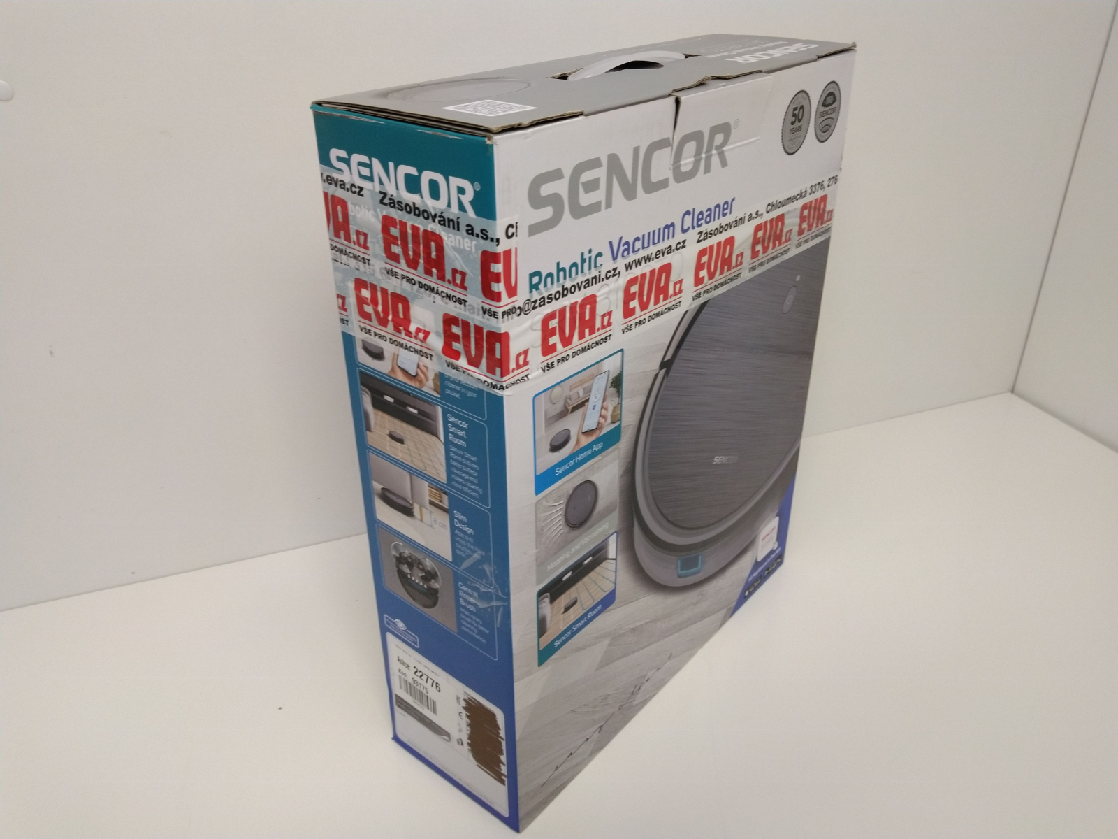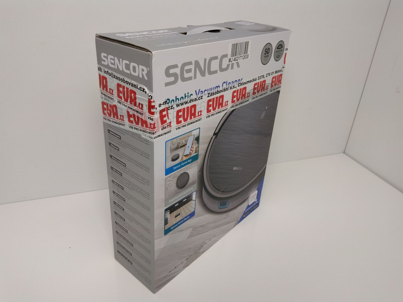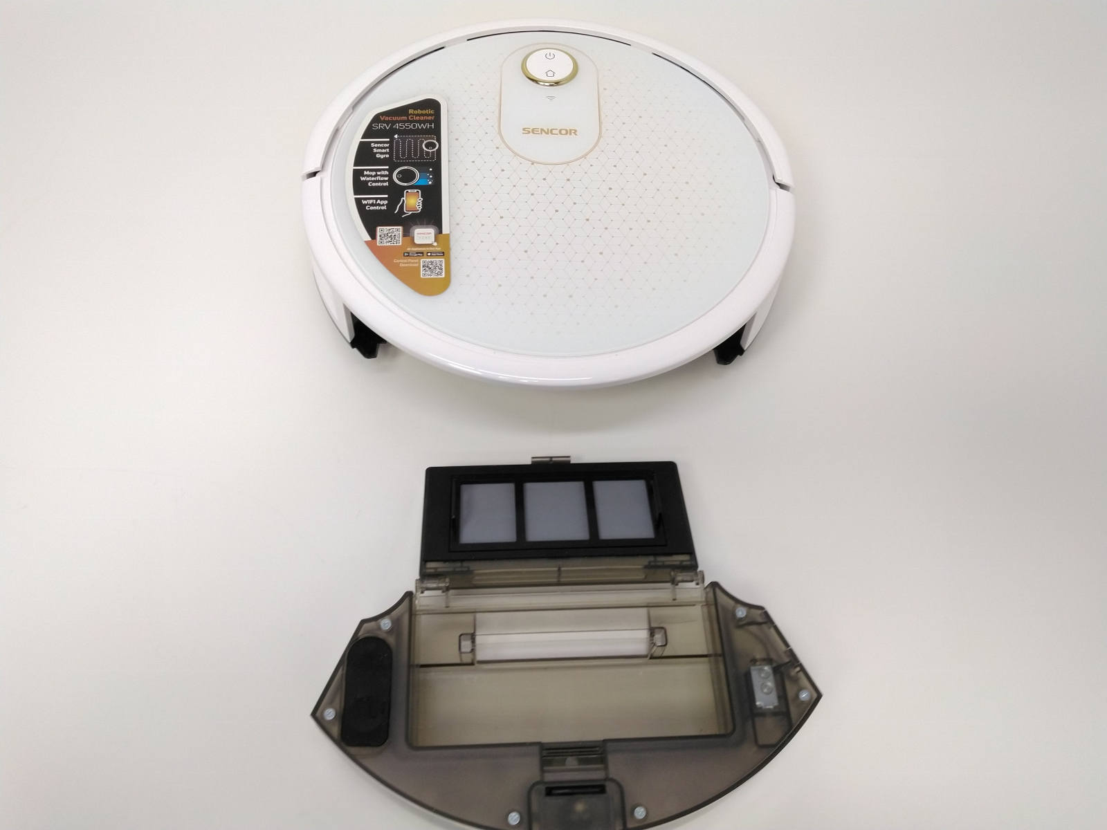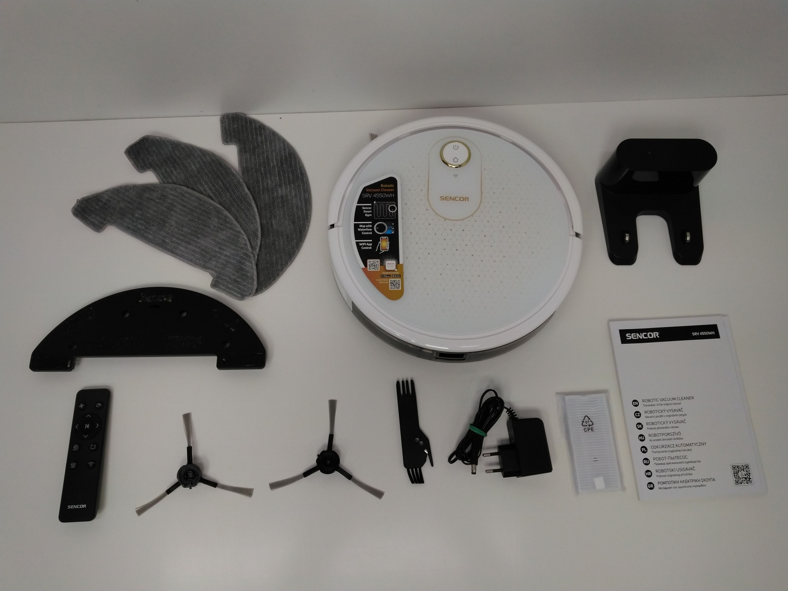 Robotický vysavač s mopováním, ovládání pomocí dálkového ovladače nebo pomocí aplikace SENCOR HOME, jednoduché spárování pomocí Bluetooth, Sencor Smart Gyro pro efektivní pohyb, inteligentní senzory proti nárazu a pádu, rotační kartáč a dva boční kartáčky, automatické zvýšení výk celý popisonu na koberci, výška robota pouhých 7,5 cm, průměr 31 cm, baterie Li-Ion 2 600 mAh, doba nabíjení 5 hodiny, výdrž baterie 100 minut, hlučnost 59 dB, 3 úrovně sání a 3 intenzity mopování. Obsah balení: robotický vysavač SENCOR SRV 4550WH včetně dvou bočních kartáčů a filtrů, nabíjecí základna, síťový adaptér, dálkový ovladač, mopovací nástavec, 3× textilní mopovací návlek, 2× AAA baterie, 2× náhradní boční rotační kartáč, 1× náhradní HEPA filtr, 1× náhradní molitanový filtr, čisticí kartáček. Hmotnost 2,4 kg, rozměry (š x v x h): 310 x 75 x 310 mm.