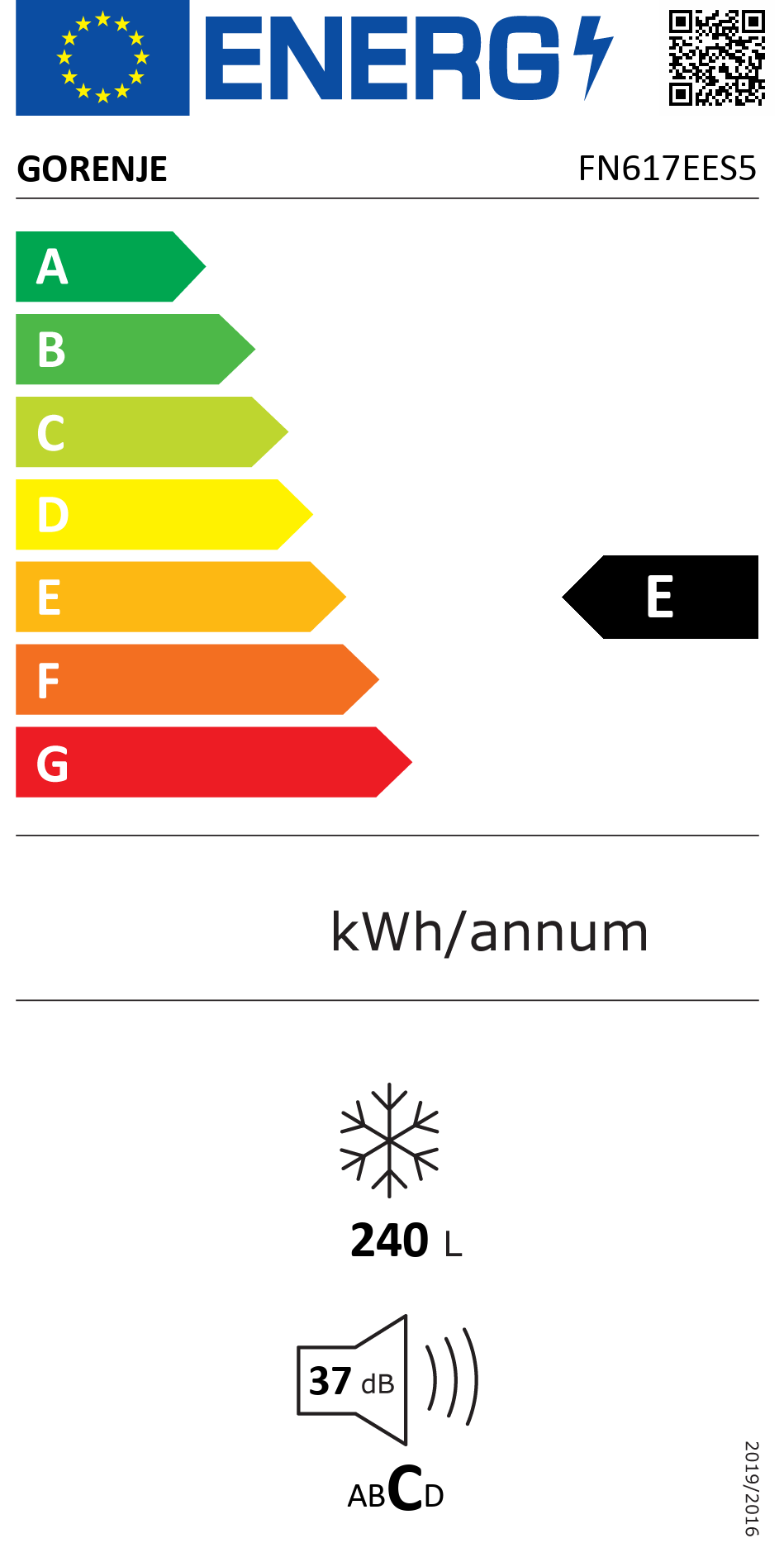 Mraznička o objemu 240 l, energetická třída E, spotřeba 234 kWh/rok, mrazící výkon 10,8 kg/24 hodin, akumulační doba cca 10 hodin, 2 police, 5 šuplíků, hlučnost 37 dB/C, rozměry 595 x 1720 x 590 mm.