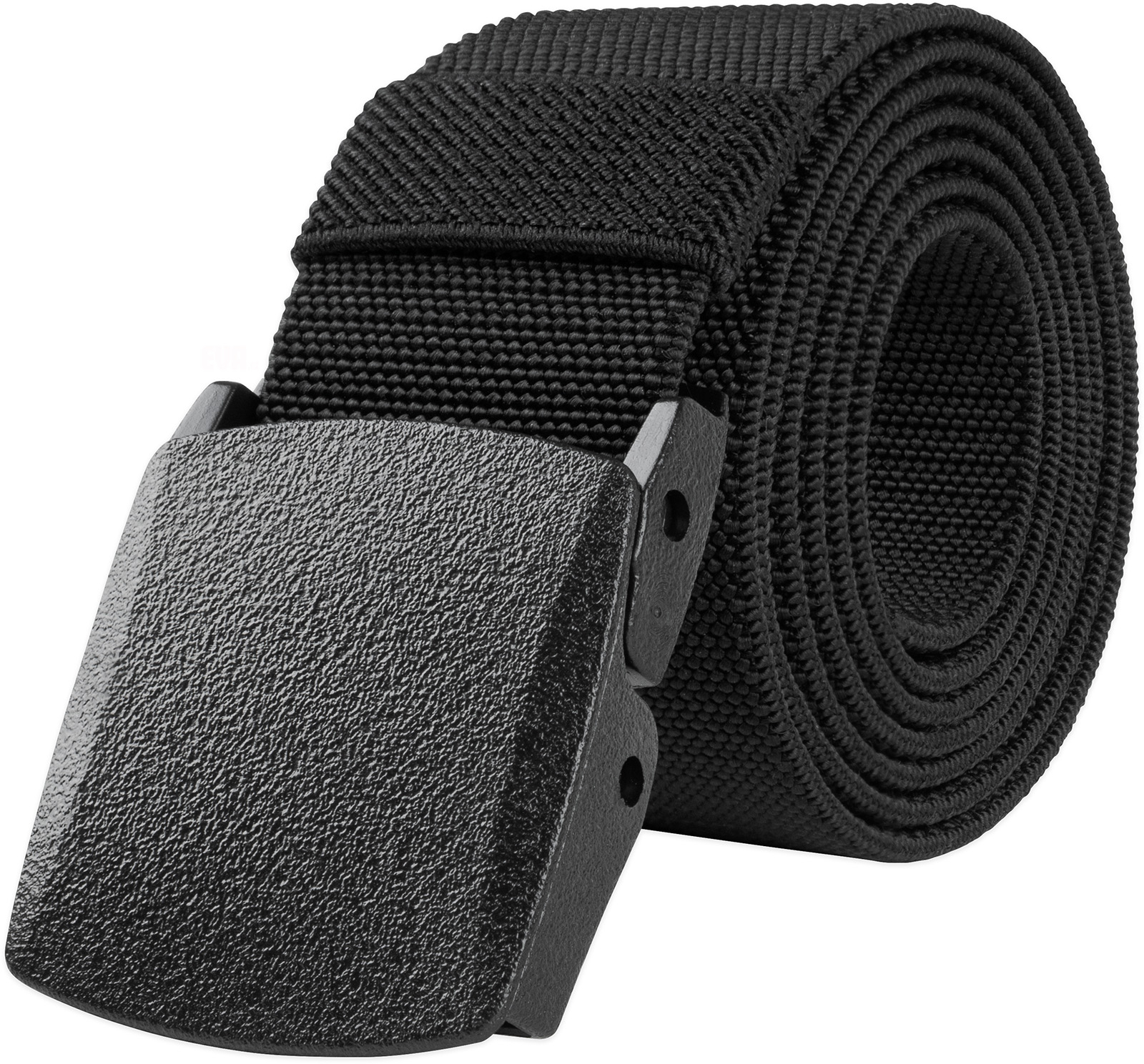 Pružný černý pásek z elastického pleteného polyesteru s plastovou přezkou. Celková délka bez přezky 140 cm, šířka 4 cm, šířka přezky 4,8 cm. Délka při maximálním natažení 183 cm.