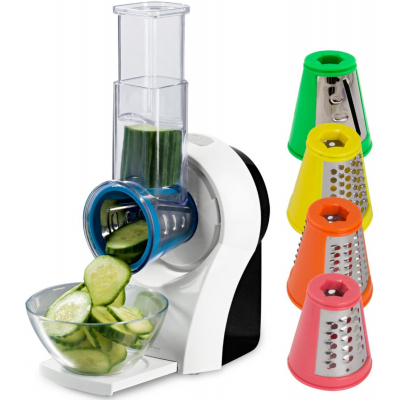 Elektrický kráječ s pěti výměnnými nástavci: hrubé struhadlo, jemné struhadlo, tenké plátky, silné plátky, struhadlo na pyré. Jednoduché strouhání přímo do misky nebo na talíř, menší praktické provedení. Příkon 150 W. Doba nepřetržitého provozu max. 2 minuty, doba chlazení před d celý popisalším použitím min. 3 minuty, protiskluzové nožičky, délka přívodního kabelu 125 cm, hmotnost 1,4 kg, rozměry (š x v x h): 130 x 255 x 150 mm.