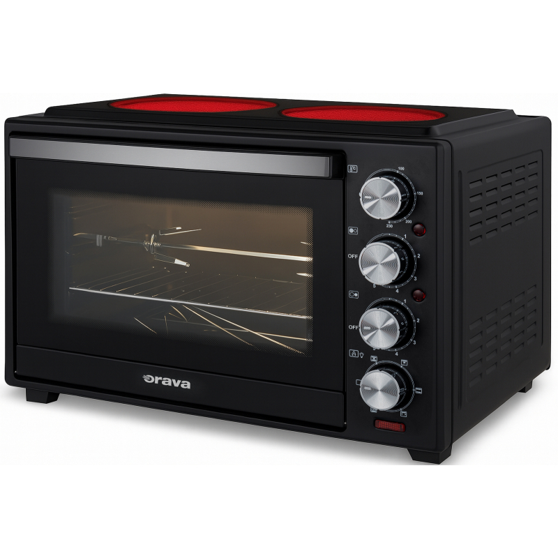 Elektrická trouba s dvouvařičem, objem 38 l, příkon 3500 W, funkce trouby a vařiče současně, sklokeramická varná deska, dvě plotýnky o průměru 170 a 190 mm, malá plotna příkon 800 W, velká plotna 1200 W, lze vařit, péct, zapékat či grilovat, nastavení teploty od 100 do 230 °C, sa celý popismostatná regulace jednotlivých ploten, elektrický termostat, otočný rožeň, barva černá, součástí balení: grilovací rošt a odkapávací plech, hmotnost 10,9 kg, rozměry (š x v x h): 533 x 348 x 390 mm.