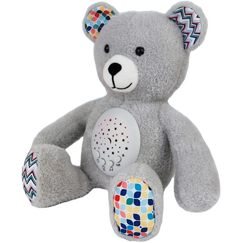 Usínáček s projekcí. Velikost medvídka 24 cm. Tlačítko světla jedním stisknutím rozsvítí projekci, další stisknutí zvyšují intenzitu svícení a 4. stisknutím se zhasne. Tlačítko s notou spouští ukolébavky. Celkem 7 písniček, které se přepínají opětovným stisknutím. Tlačítko s vlno celý popisu zapíná bílý šum. Stisknutím se spustí jeden ze tří bílých šumů, který trvá vždy 30 min a poté se vypne. Projektor lze vyjmout z bříška medvěda. Baterie 2 x AA nejsou součástí. Tlačítko ON//OFF přidržením po dobu 2s se zapne/vypne. Vhodné pro děti od narození.