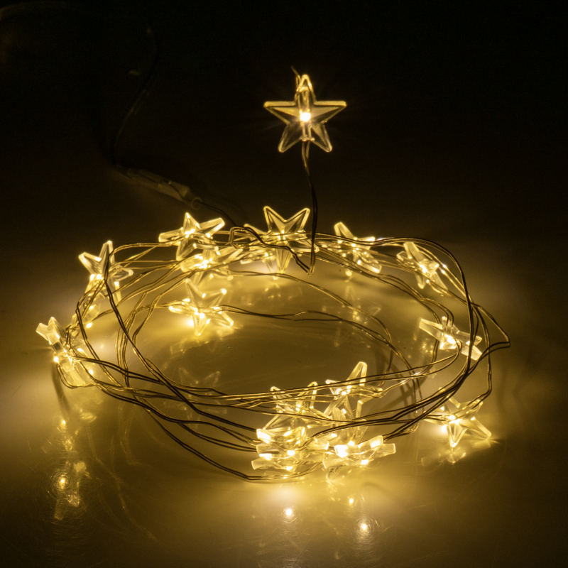 Počet LED diod: 20, barva světla teplá bílá, vzdálenost diod 10 cm, délka osvětleného kabelu 1,9 m, barva osvětleného kabelu transparentní, délka přívodního kabelu 0,3 m, napájení 3 x AA tužkové baterie (nejsou součástí), třída ochrany IP20 - vhodné pro vnitřní použití.