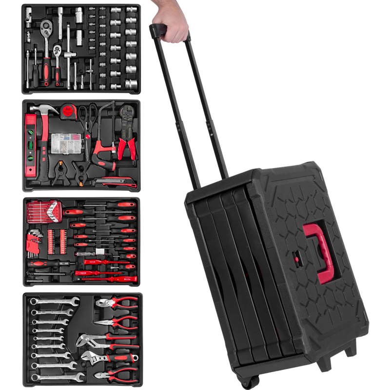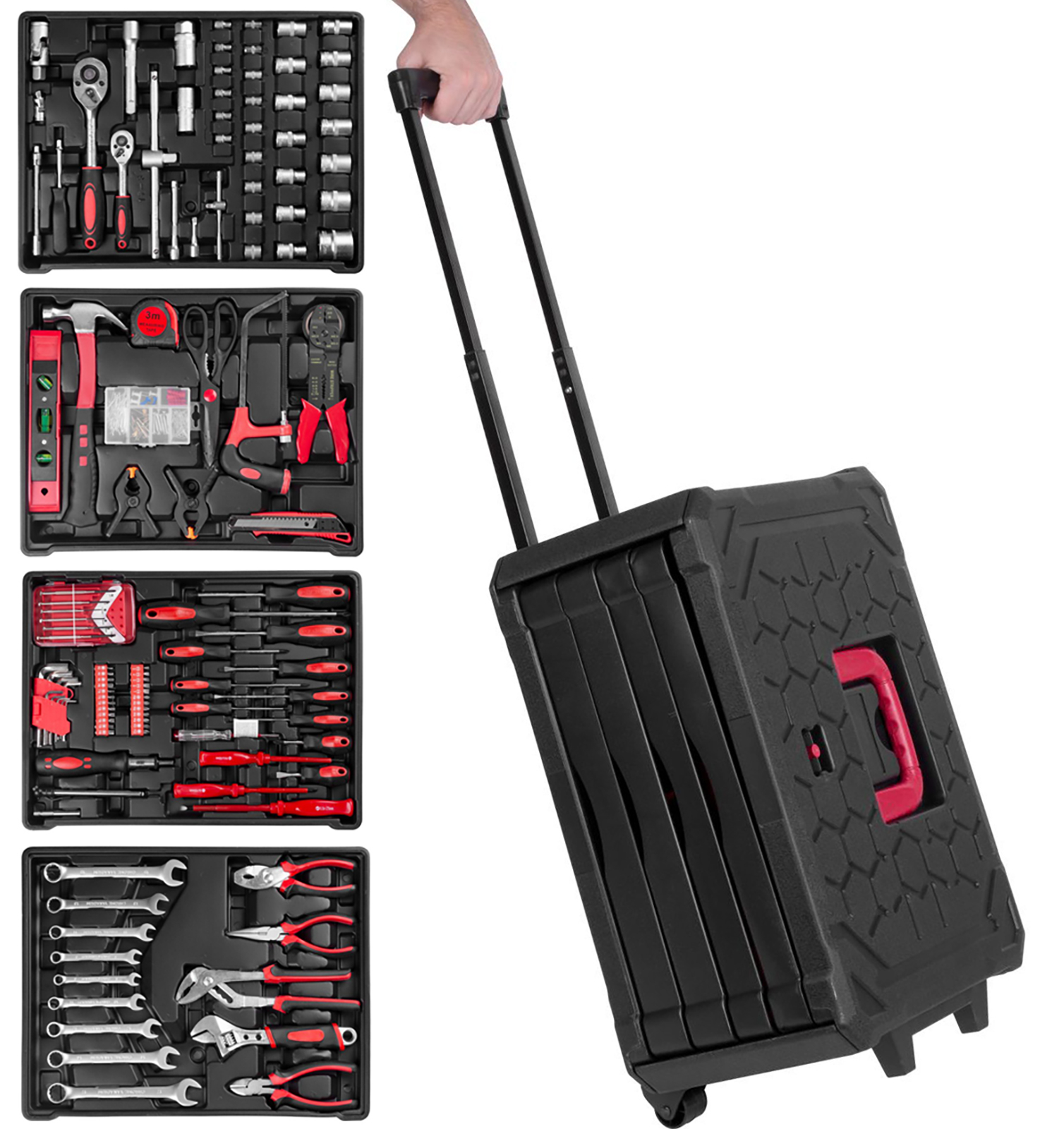 Sada 254 ks nářadí v praktickém kufru na kolečkách s výsuvným madlem a horním držadlem nabízí ploché klíče, ráčny i nástavce z odolné CrV oceli. Nářadí je přehledně uspořádáno ve 4 zásuvkách, což usnadňuje organizaci a rychlý přístup. Kufr má rozměry 35 × 52 × 26 cm a hmotnost 14 celý popis,3 kg. Kompletní obsah sady je uveden v detailním popisu níže.