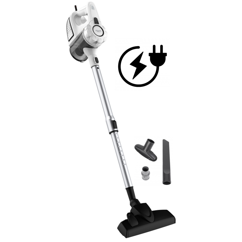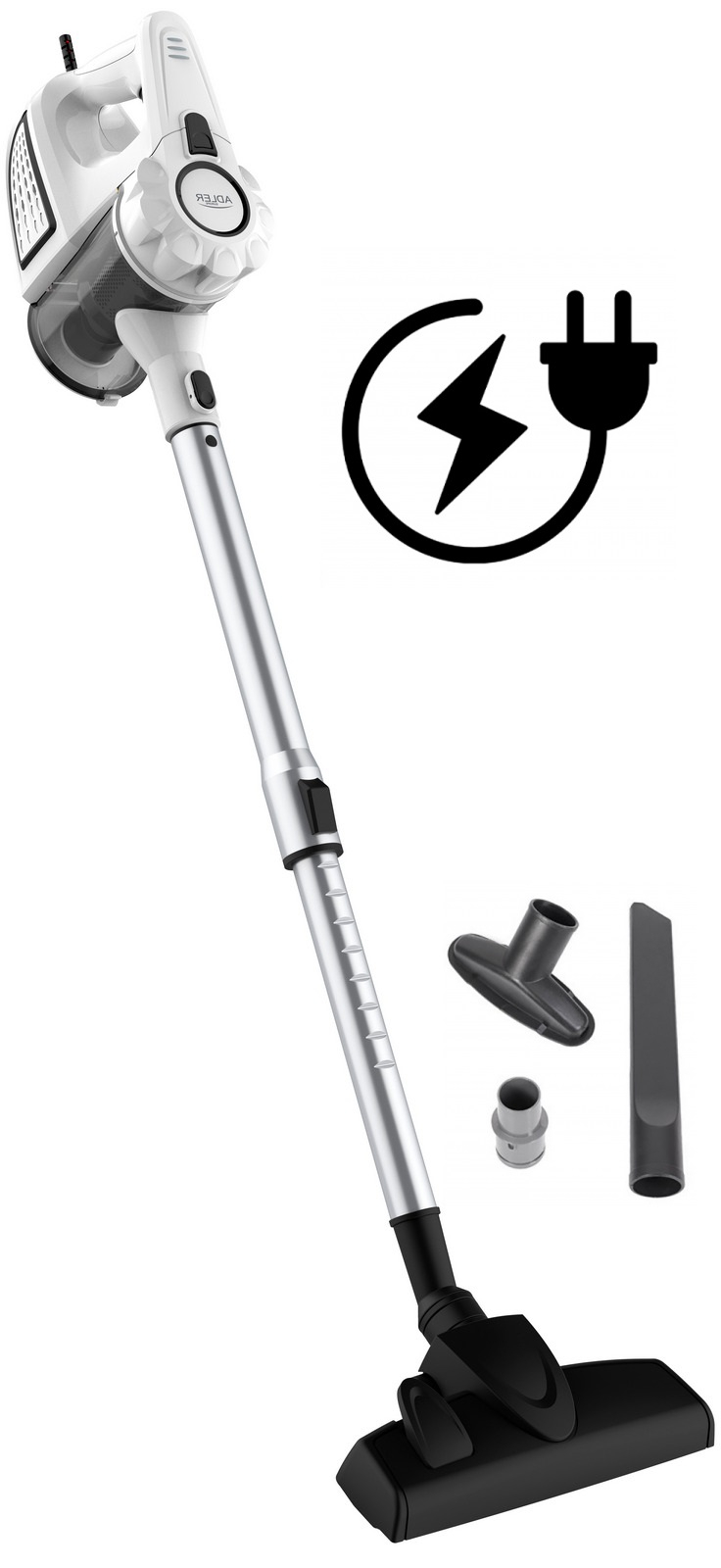 Tyčový a ruční vysavač 2v1 do elektrické sítě 230V, motor s příkonem 800W, akční rádius 6 m, sací výkon 17 000 Pa, teleskopická tyč, nádobka na prach 1,5 l, 3 stupňový filtrační systém, váha vysavače 2,14 kg, přívodní šňůra 5m. rozměry (š x v x h) 210 x 1200 x 235 mm.