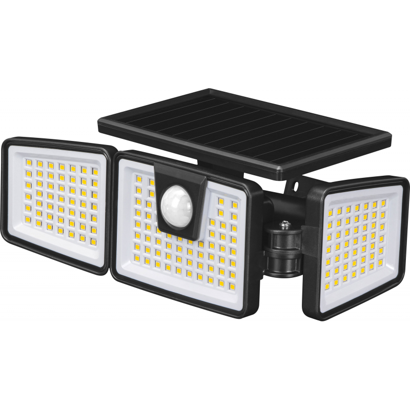 Solárně napájené venkovní LED světlo s vestavěným akumulátorem, světelný tok 700 lm, teplota světla 4000 K (neutrální bílá), 3 reflektory polohovatelné ve dvou osách, PIR senzor pohybu a setmění s nastavitelnou citlivostí, detekční pole senzoru 120 ° a 3-7 m, třída krytí lP 44 (o celý popisdolá stříkající vodě), vestavěný Li-ion akumulátor 3,7 V 1200 mAh, doba nabíjení na Slunci cca 8 h, doba svícení až 8 h v závislosti na zvoleném režimu. Součástí reflektoru je držák s otvory pro montáž, vrtuty a hmoždinky. Je důležité, aby solární panel byl vystavený přímému Slunci po celý den, vyhněte se natočení panelu k budovám, stromům nebo k jiným překážkám.